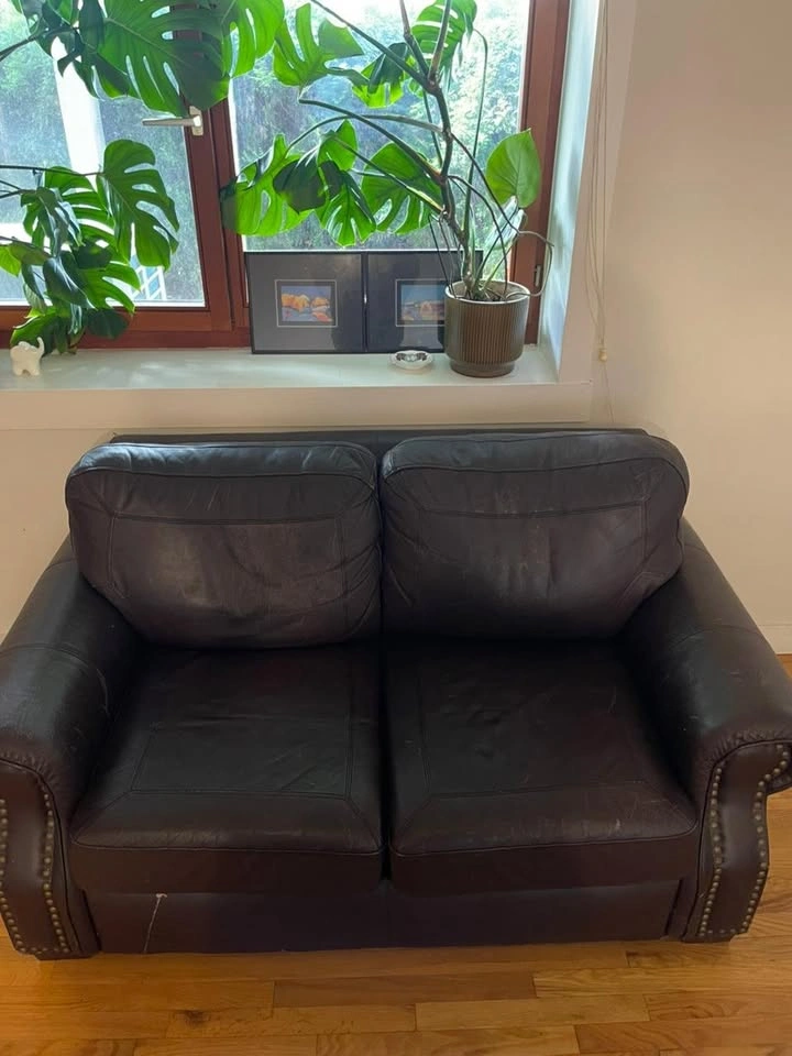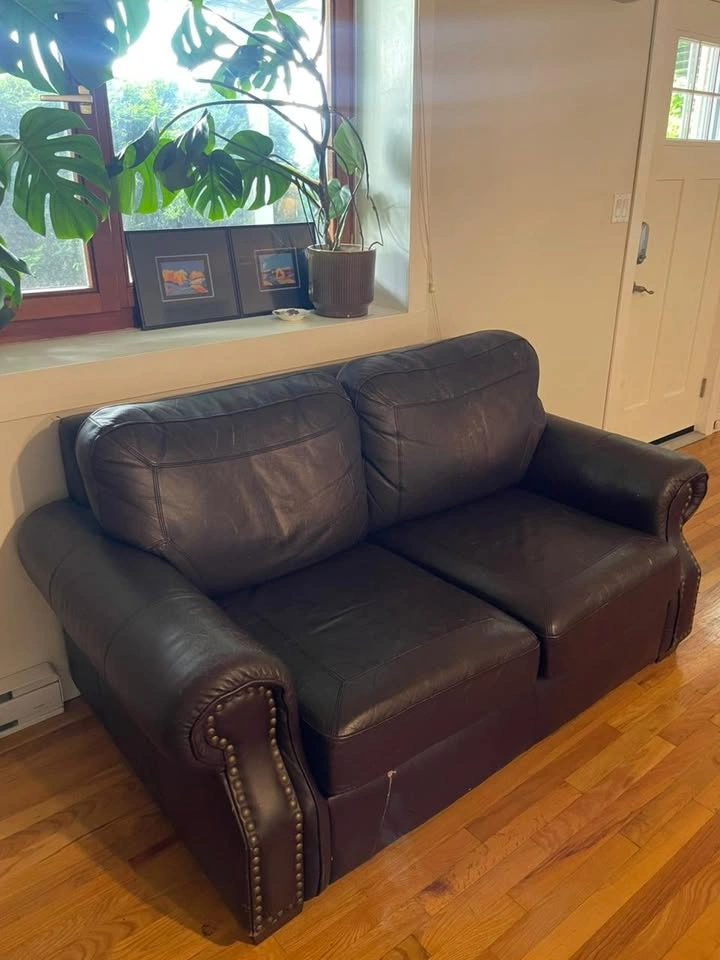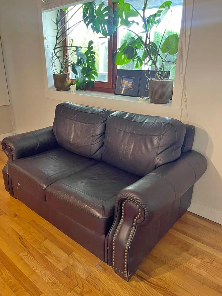 10Dark red leather, used with some scratches but still very firm and comfortable. 38in Deep, 65in Wide, 28in Tall. $250