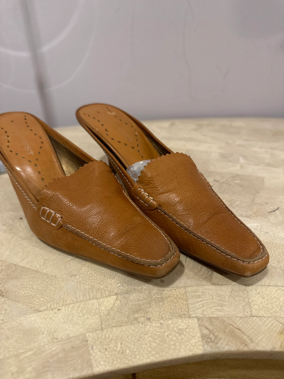 These are a beautiful pair of leather mules with a pointed toe and a stiletto heel. They are a great way to add a touch of elegance to any outfit.