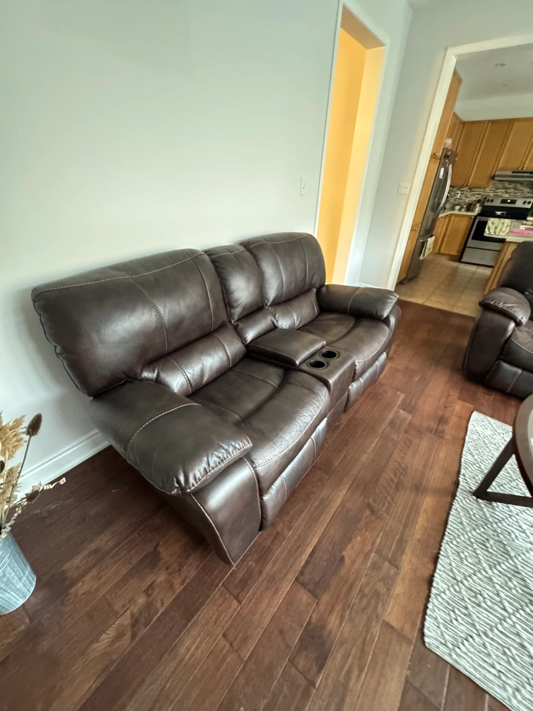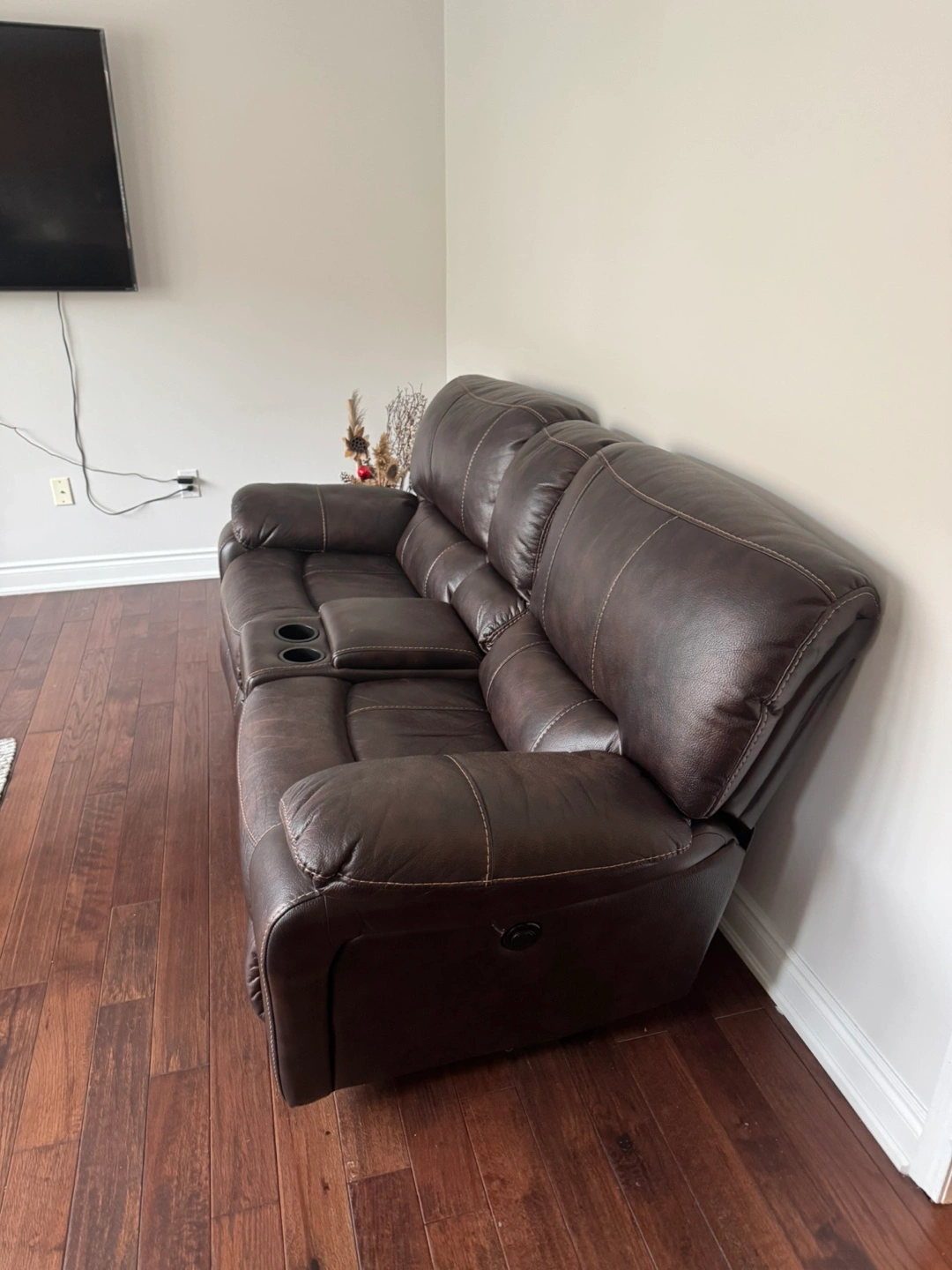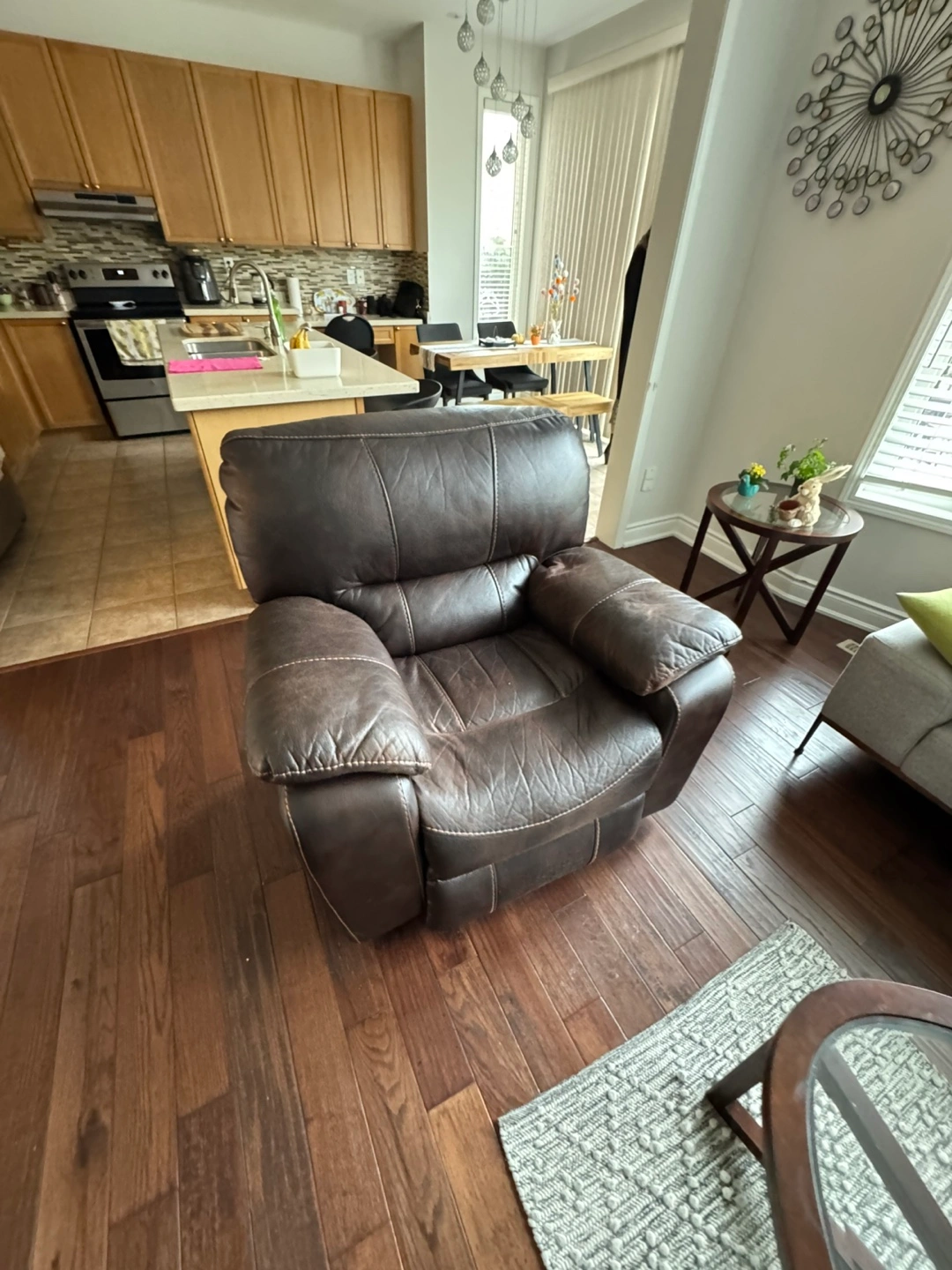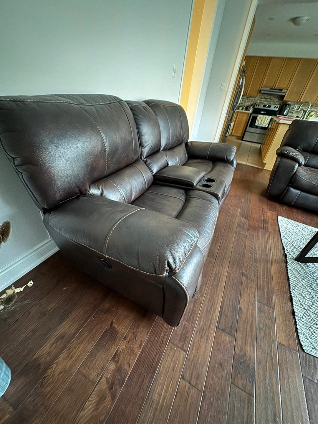 15Matching brown leather recliner and sofa. Excellent condition. Comfortable and stylish. Sink into ultimate comfort with this used reclining sofa and chair set, perfect for any living space. The rich brown leather adds a touch of elegance, while the reclining feature lets you kick back and relax after a long day. Note that the set is in used condition, with some wear and tear, but still has plenty of life left. * Reclining function on both sofa and chair * Durable brown leather Looking at similar sets on Karrot, a fair price for a used reclining sofa and chair set of this quality is around $700. If you're reading this, the set is still available, so don't miss out!