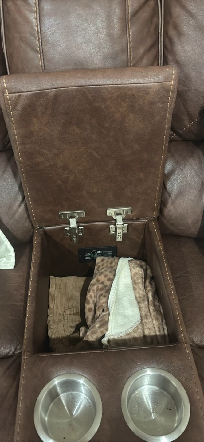 5Selling a comfy brown leather reclining loveseat! It features a centre console with cupholders and storage, perfect for movie nights or just relaxing at home. It's in good condition and ready for a new home!