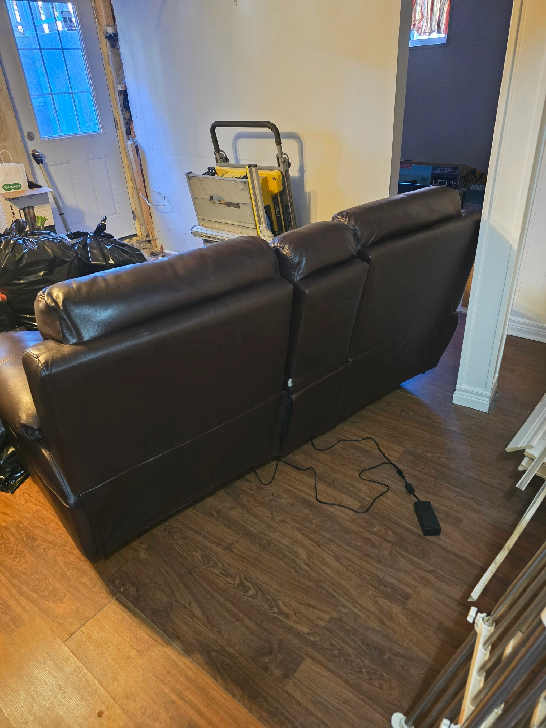 60Selling a comfortable brown leather reclining sofa! It features convenient cup holders and a reclining function for ultimate relaxation. Perfect for a cozy living room setup (electric recliner )