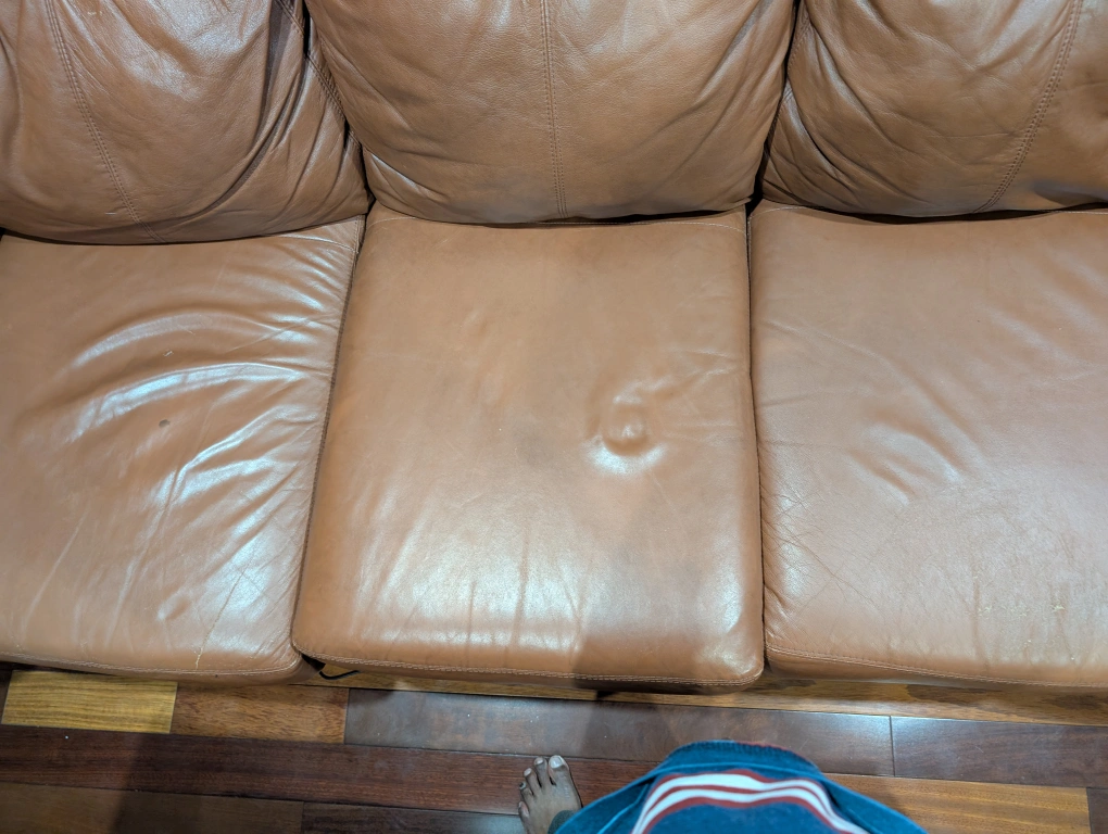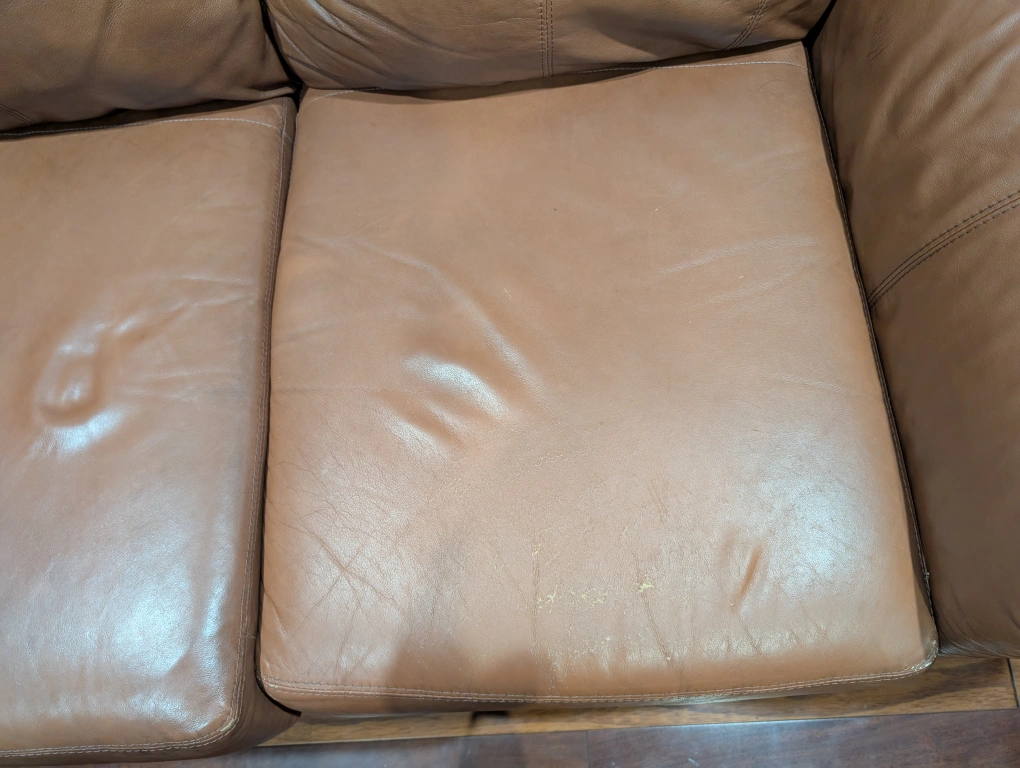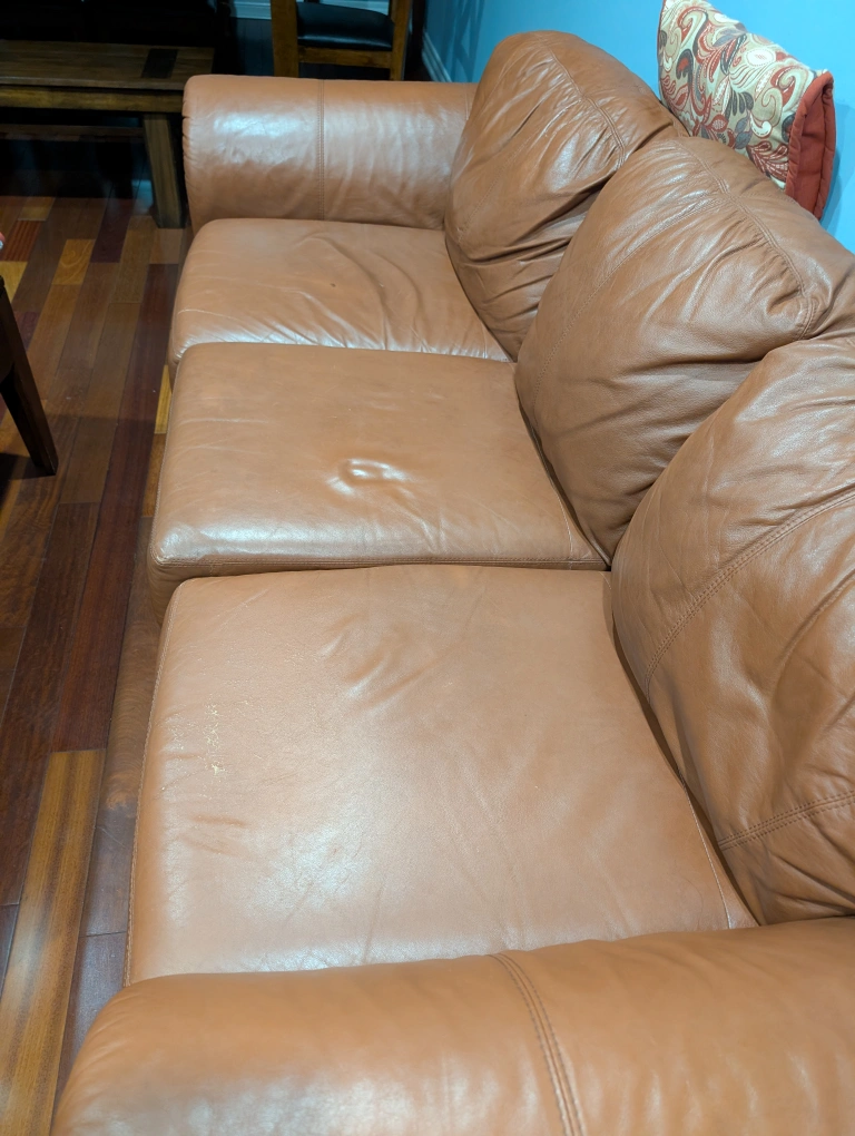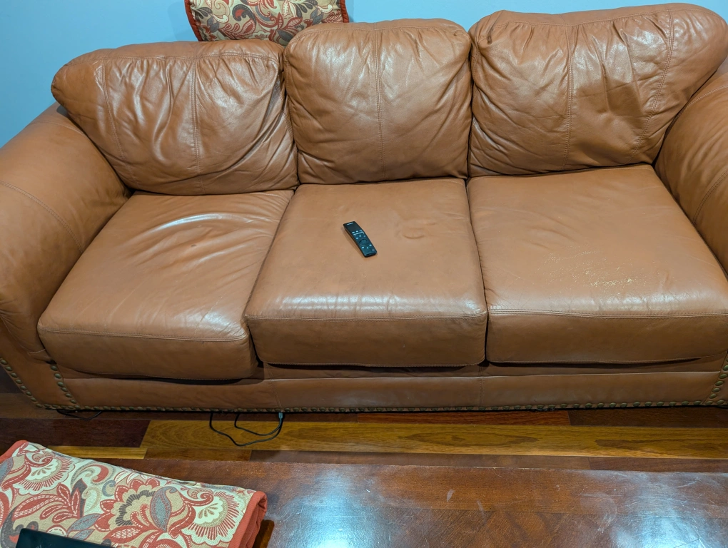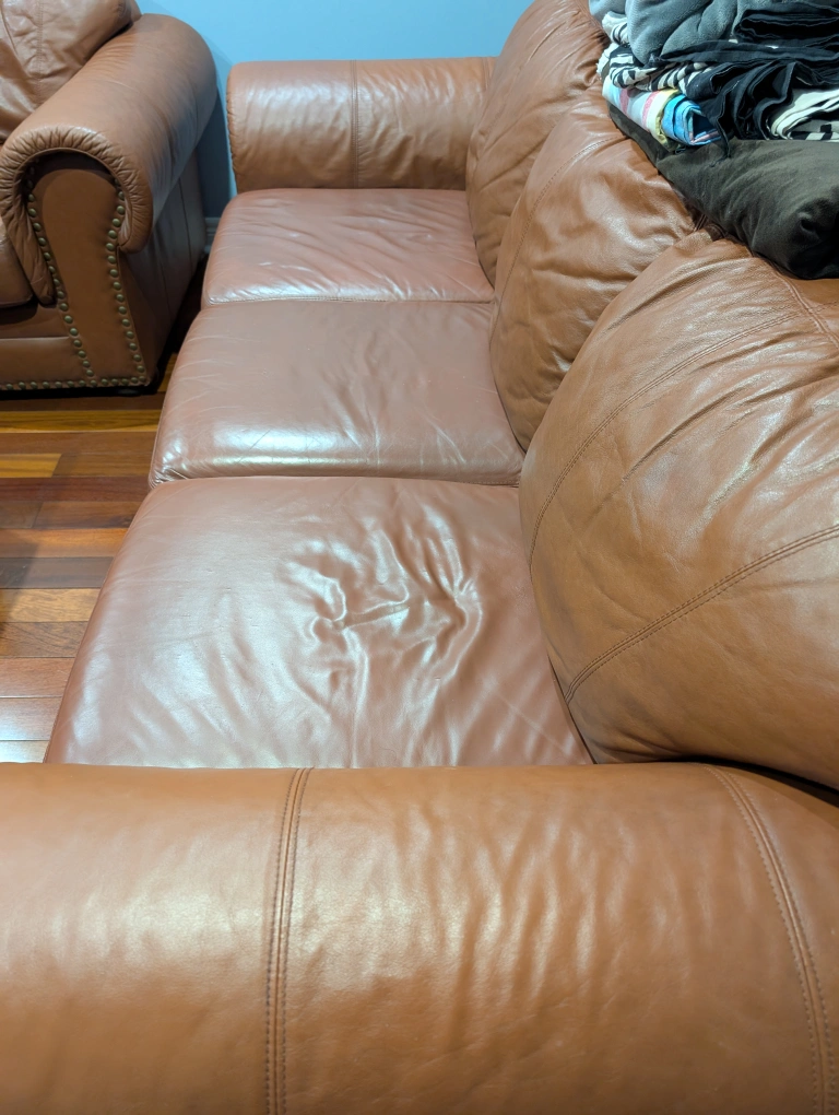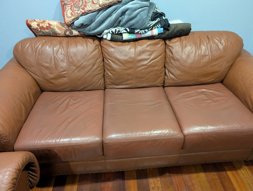5Selling a comfy brown leather sofa! It's a three-seater and has a classic look. There are some signs of wear on the cushions, but overall it's in good condition and ready for a new home