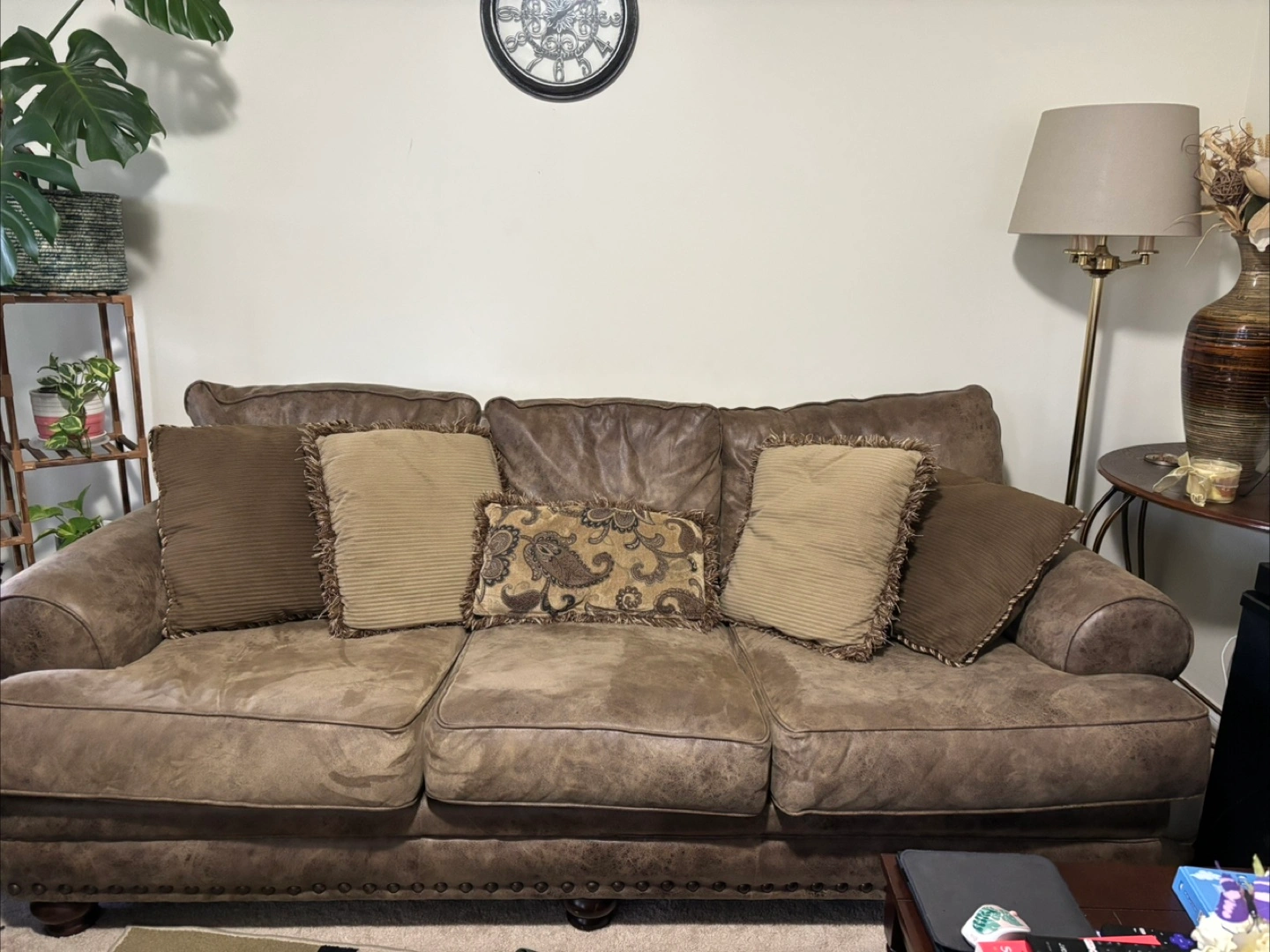 20This is a comfy brown leather sofa that would look great in any living room! It has a classic design with rolled arms and comes with a few decorative pillows. There are some signs of use, but it's still in good condition and has lots of life left!