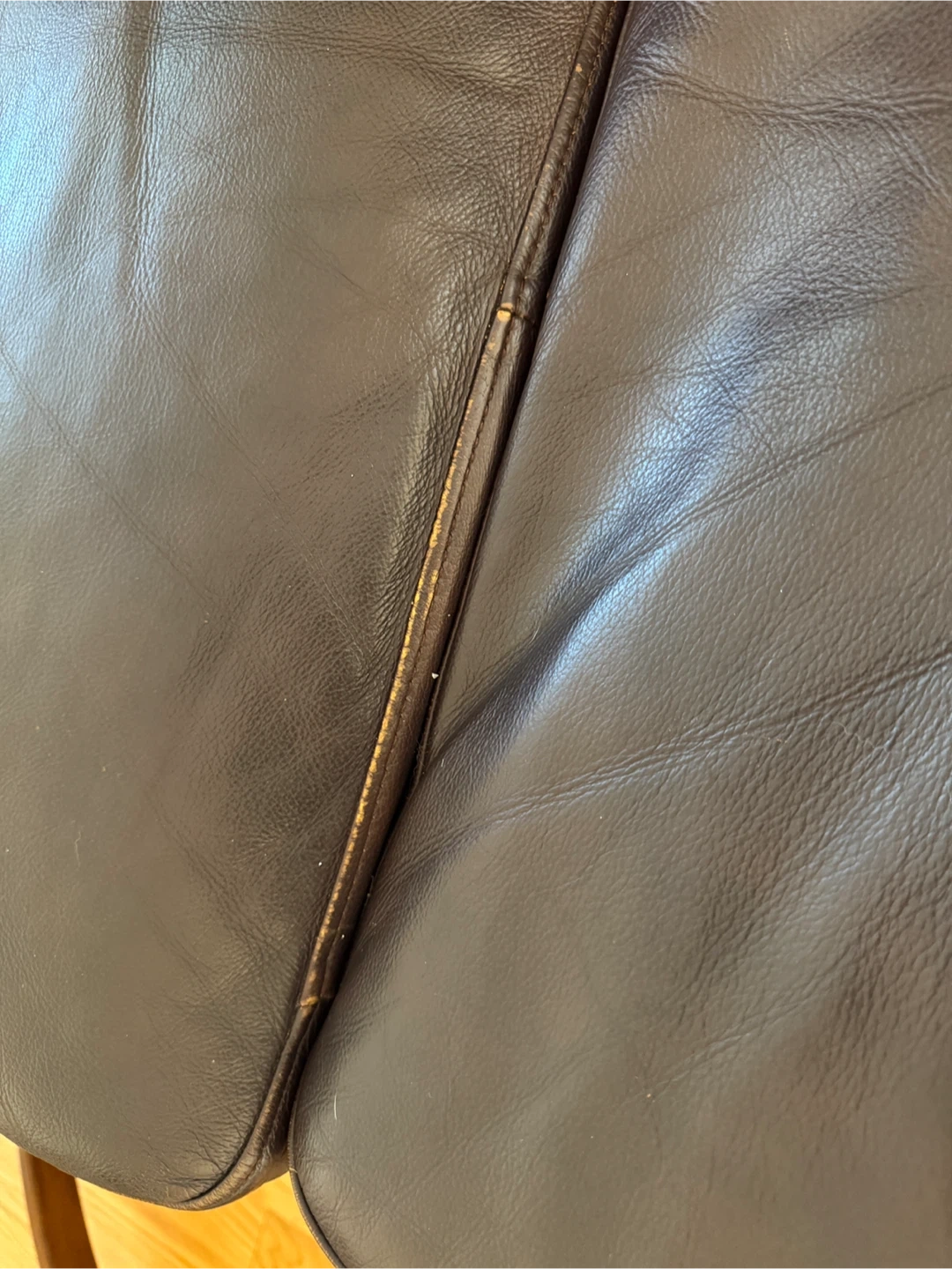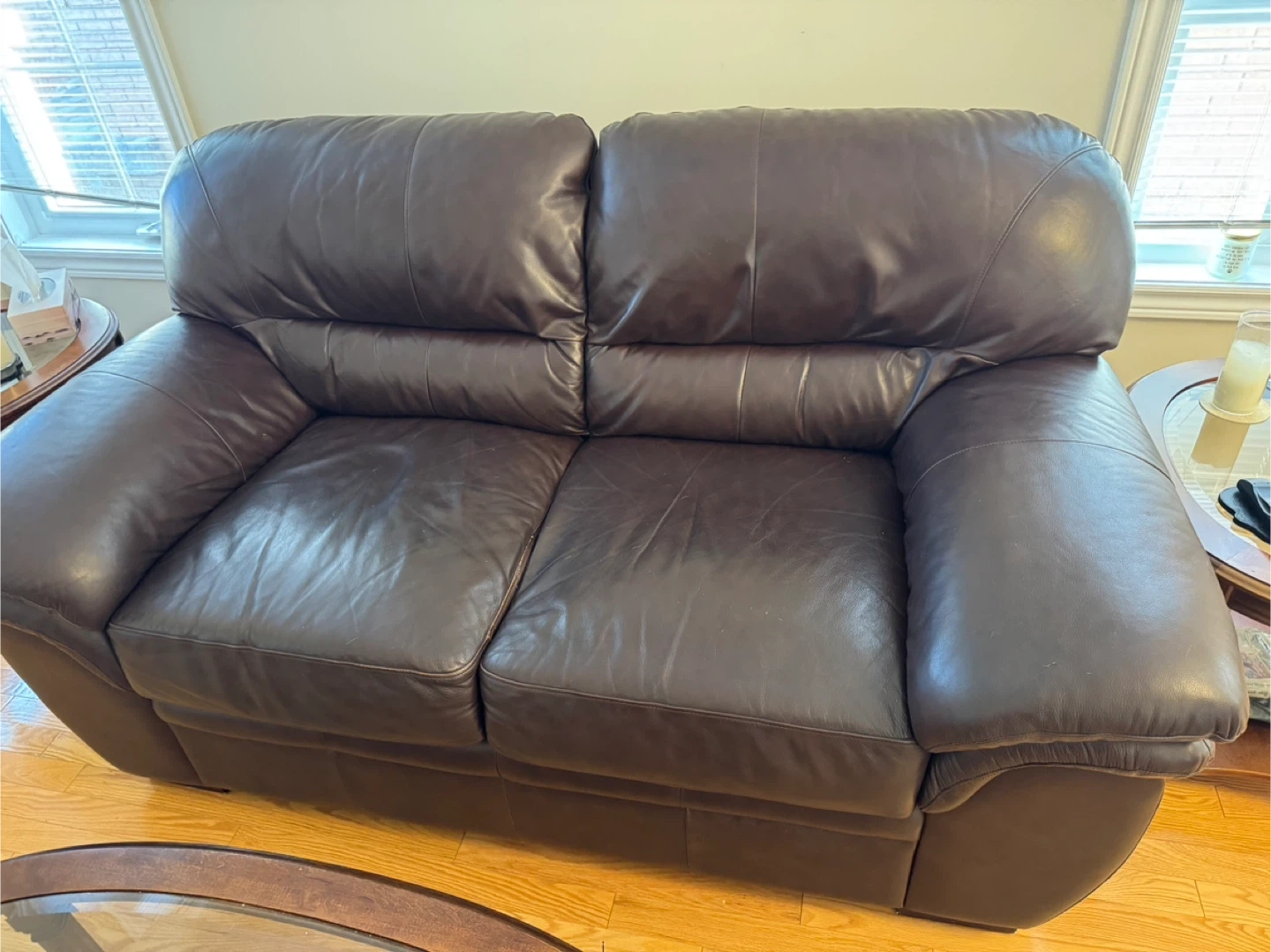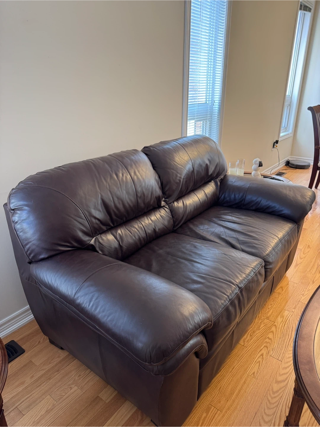 60Selling a comfy brown leather sofa. It's gently used and would be perfect for a living room or den. There are some signs of wear, as pictured, but it's still got plenty of life left! Pick up only $350 or best offer Dimensions: Back frame - 63”, with cushions - 69.5” Height - 32” (frame) / 37” with cushions Width/Depth- 37 ”