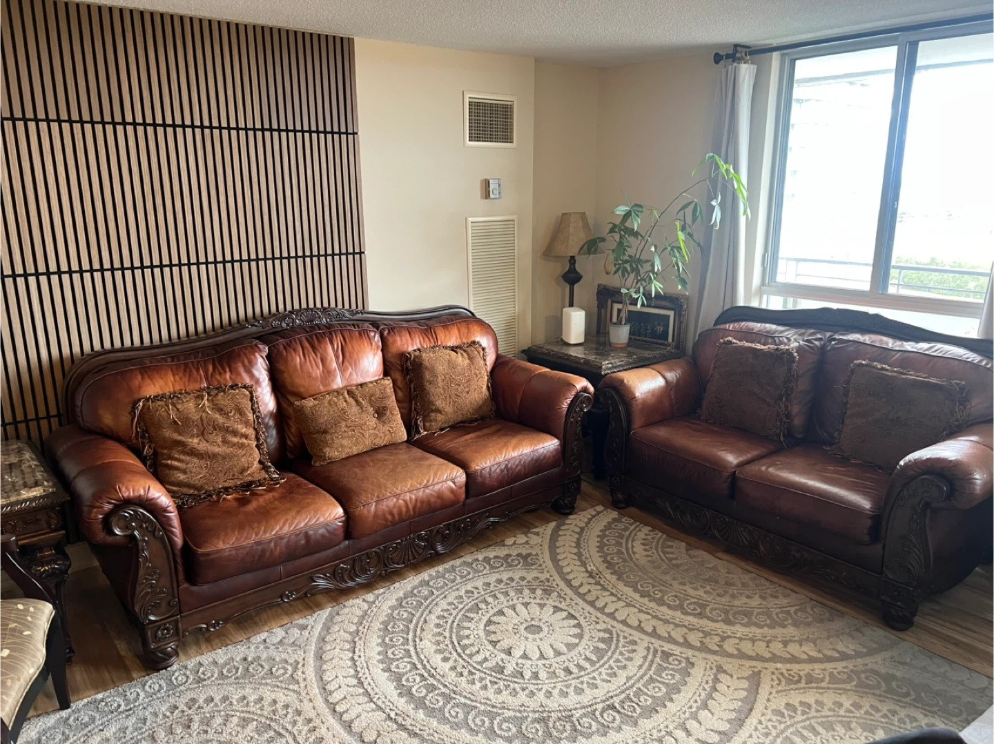 71Selling a beautiful brown leather sofa set One three-seater sofa and a two-seater sofa The set is in good condition and would be a great addition to any living room. Can include the 2 side tables for extra