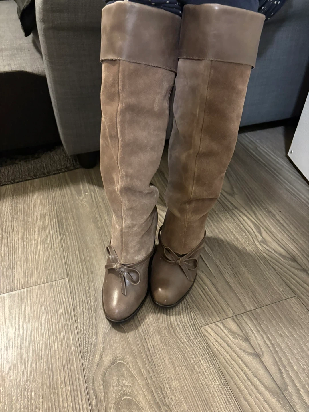 167These knee-high boots feature a stylish combination of brown leather and suede. They have a unique design with a tie detail at the ankle. Perfect for adding a touch of elegance to any outfit!