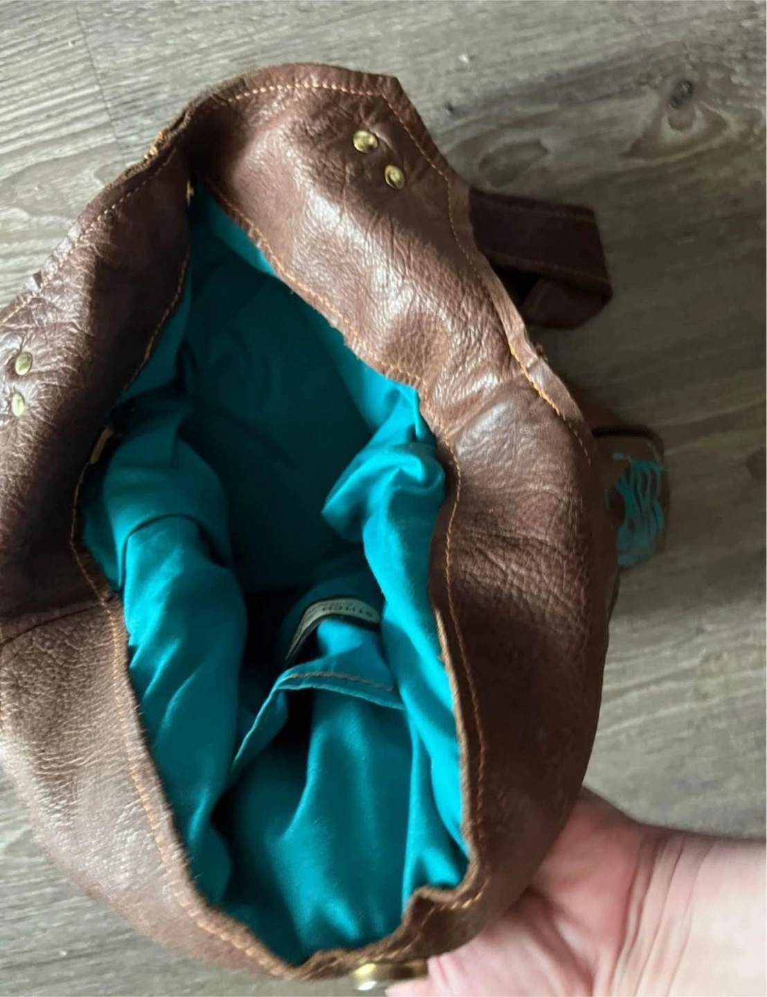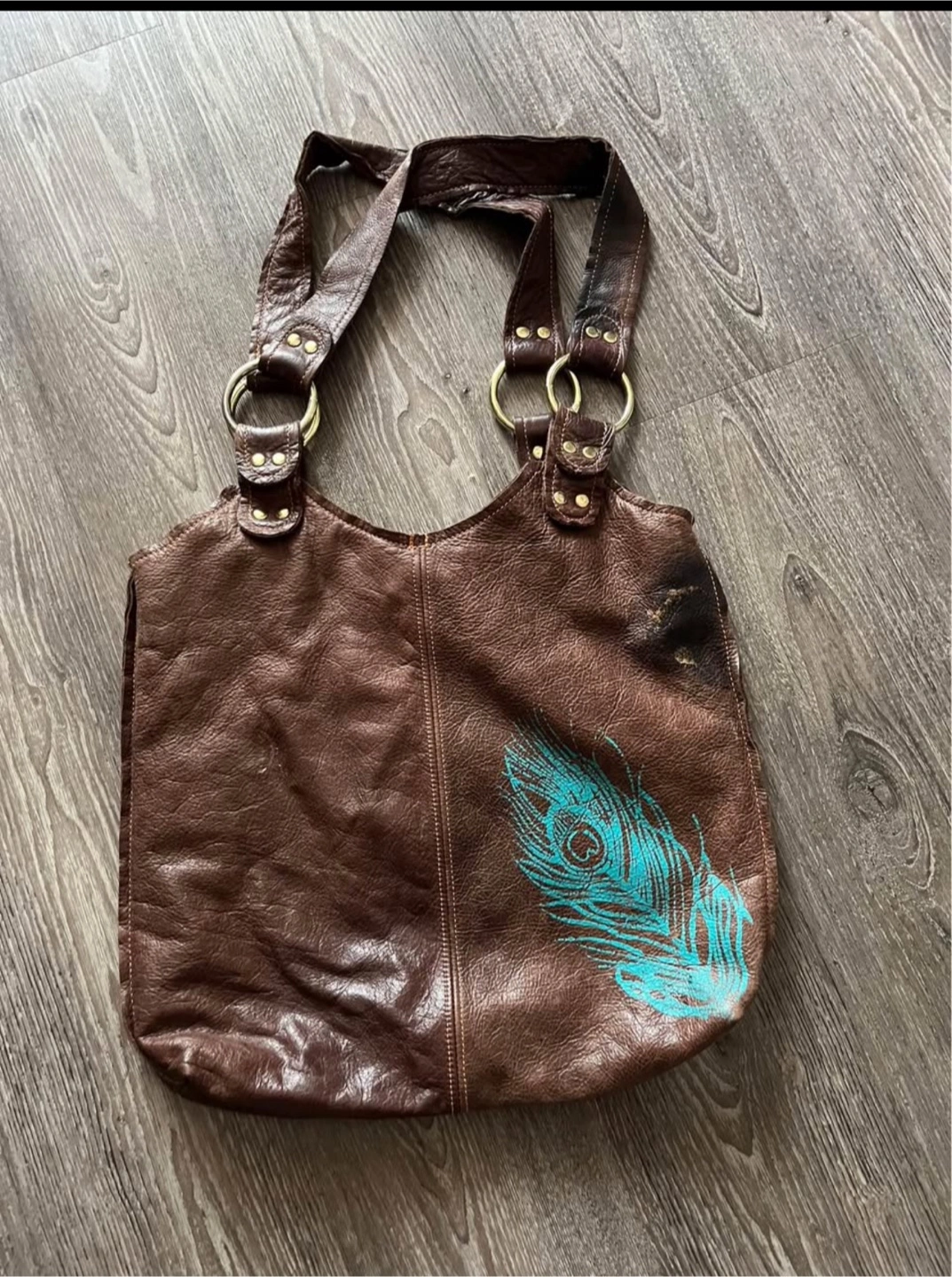 This is a brown leather tote bag with a unique peacock design on the front. It has a spacious interior with a bright teal lining. The bag features double straps and gold-tone hardware. It's perfect for everyday use!