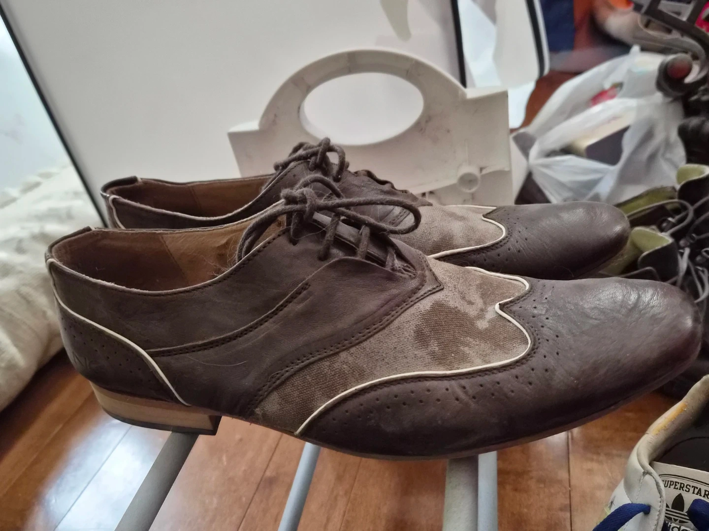 53These brown leather wingtip dress shoes have a classic look. They're in good condition and ready for a new home! Perfect for dressing up or adding a touch of sophistication to your everyday style, need some care on Leather