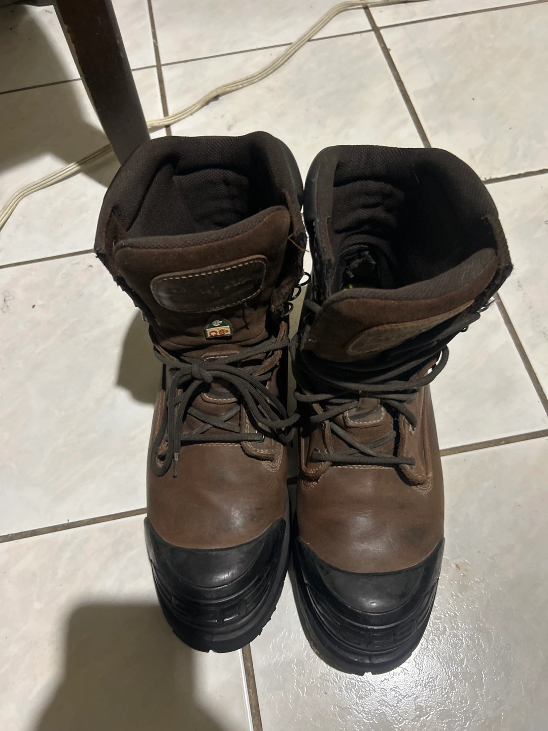 Pair of brown leather work boots. Lace-up closure. Rubber toe cap. Good condition.