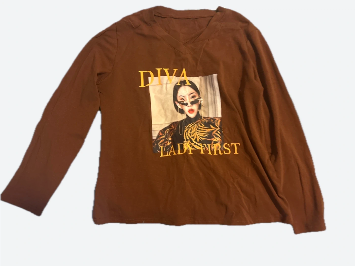 149Selling a brown long sleeve shirt with a "Diva Lady First" graphic on the front. It's in great condition and ready for a new home!