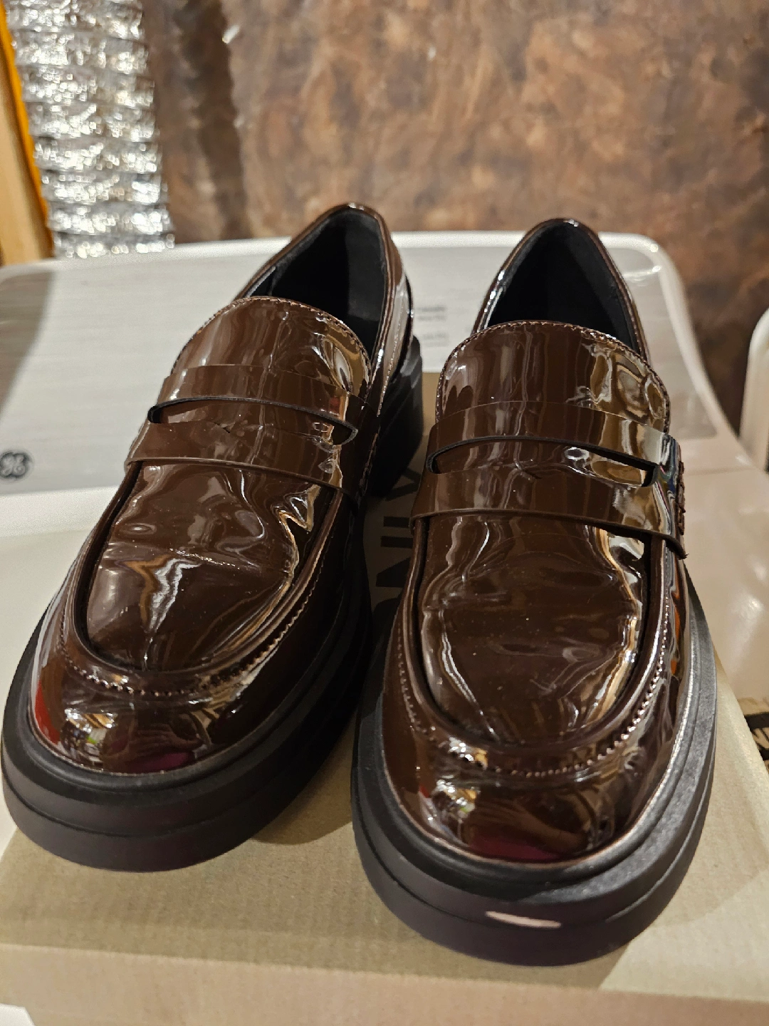 These are a pair of brown patent leather loafers. They feature a classic penny loafer design with a chunky sole. These shoes are in great condition as they've never been worn and would be a stylish addition to any wardrobe! Retail for $89 + tax. Brand: ONLY