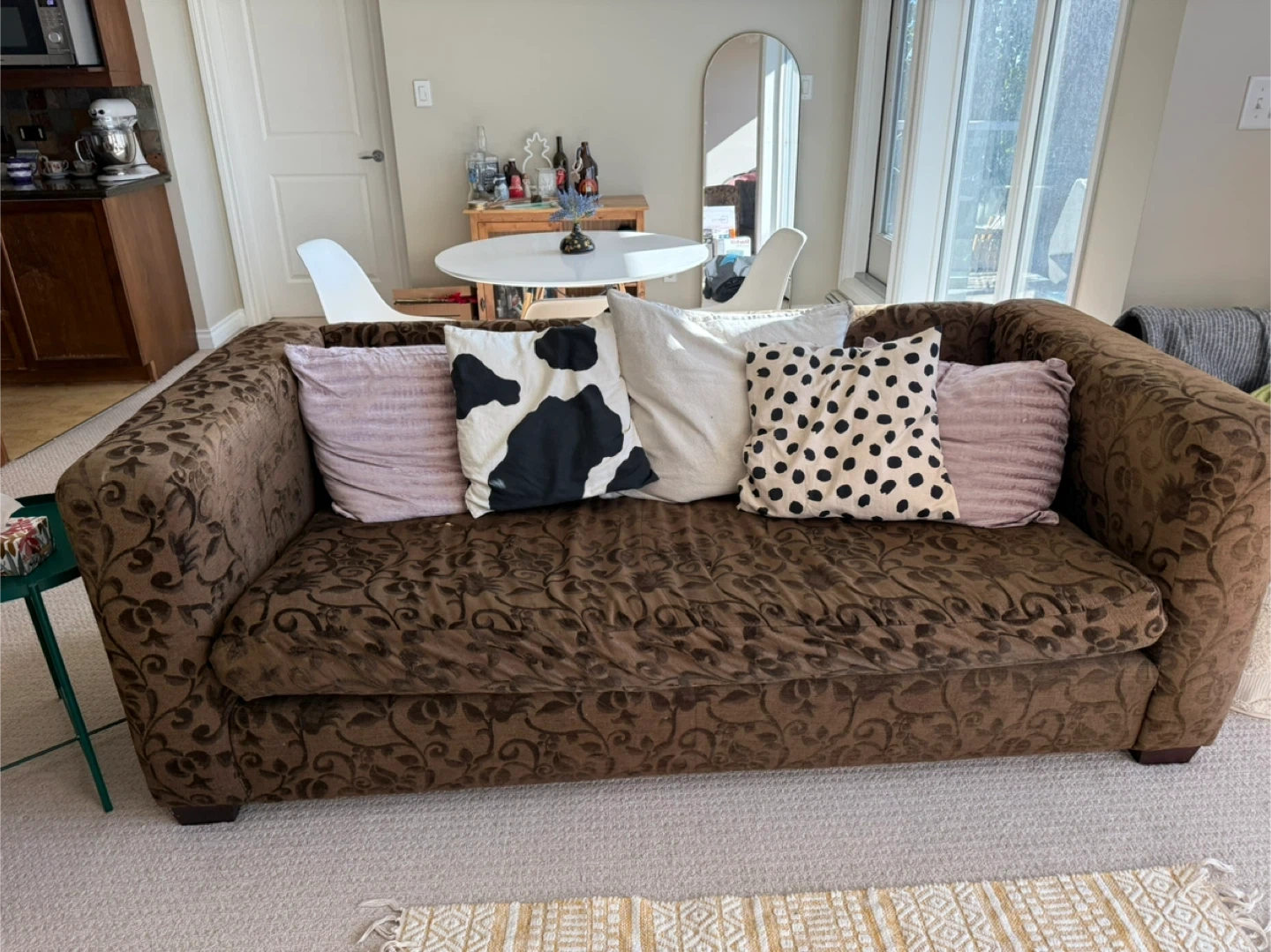 76Comfy sofa with a unique brown floral pattern! Great for adding a touch of vintage charm to your living space. The sofa is in good condition and ready for a new home! *solid wood frame, will require two people to lift it and bring it down two flights of stairs (as it doesn’t fit in the elevator unfortunately* - dog friendly home, will vaccum/steam clean it before pick up - pillows not included and will provided the original pillow in the same colour (stuffing should be replaced or you can use pillows like in the photos). - deep couch great for sleeping on or cuddling!
