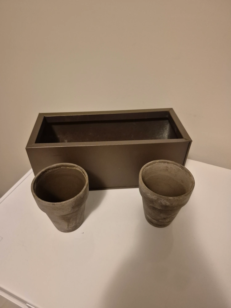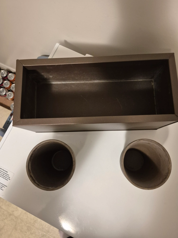 Selling a brown planter box that comes with two matching pots. It's in great shape and ready to add some greenery to your space! Perfect for indoor or outdoor use! You can even add holes to the bottom of the planter box, if you need more drainage for your plants! Curbside pickup M-Sat 5pm-9pm Or Delivery within London for an extra $5!