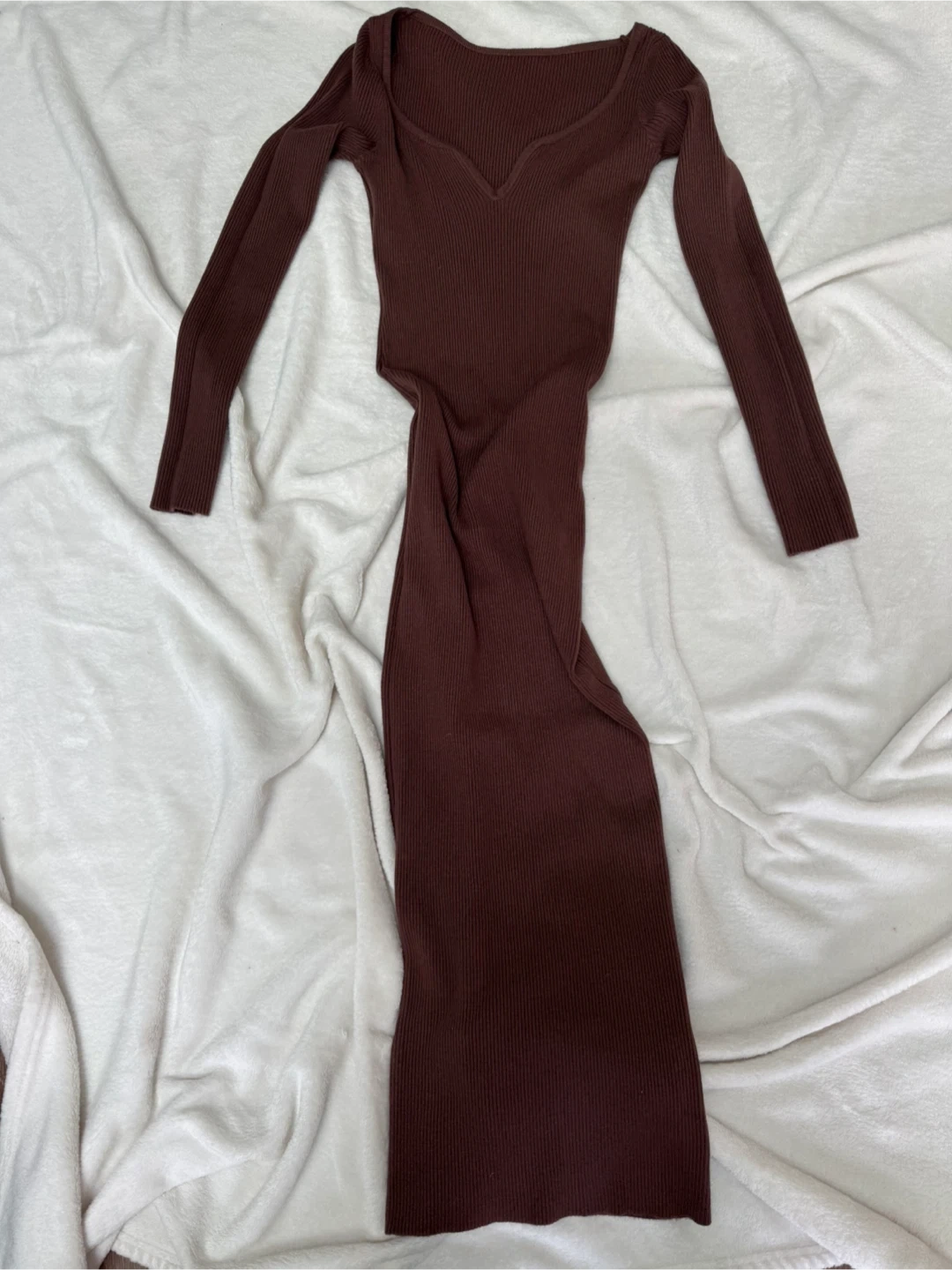 76Chic and flattering long sleeve ribbed dress in a rich chocolate brown shade. Soft, stretchy fabric that hugs your shape beautifully — perfect for fall or a night out! Details: • Condition: New / never worn • Style: Bodycon, long sleeve, deep neckline • Colour: Chocolate brown • Length: Midi • Fabric: Ribbed stretch knit • Super comfortable and elegant fit 📍Pickup Mississauga 💲15