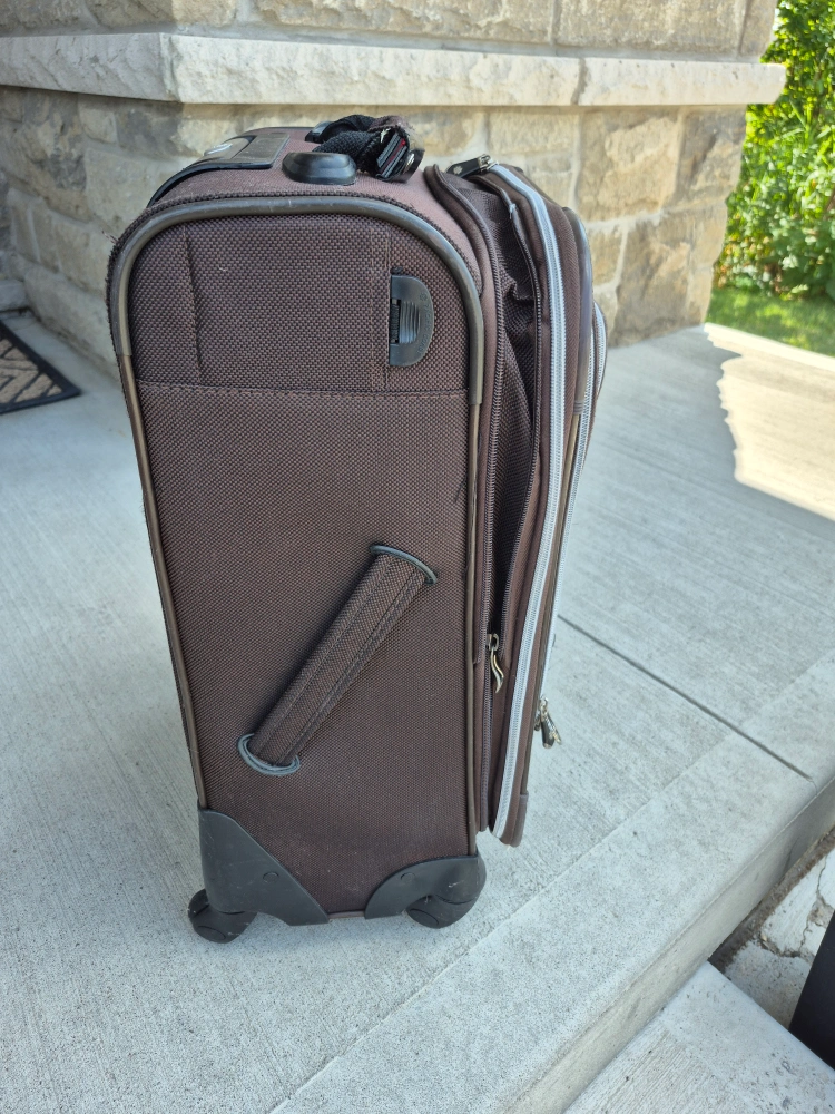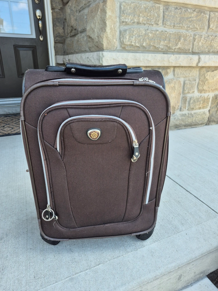 I'm selling a brown rolling suitcase. It's in good condition and ready for your next trip! It has a retractable handle and smooth-rolling wheels for easy maneuvering. Perfect for carry-on or checked baggage.