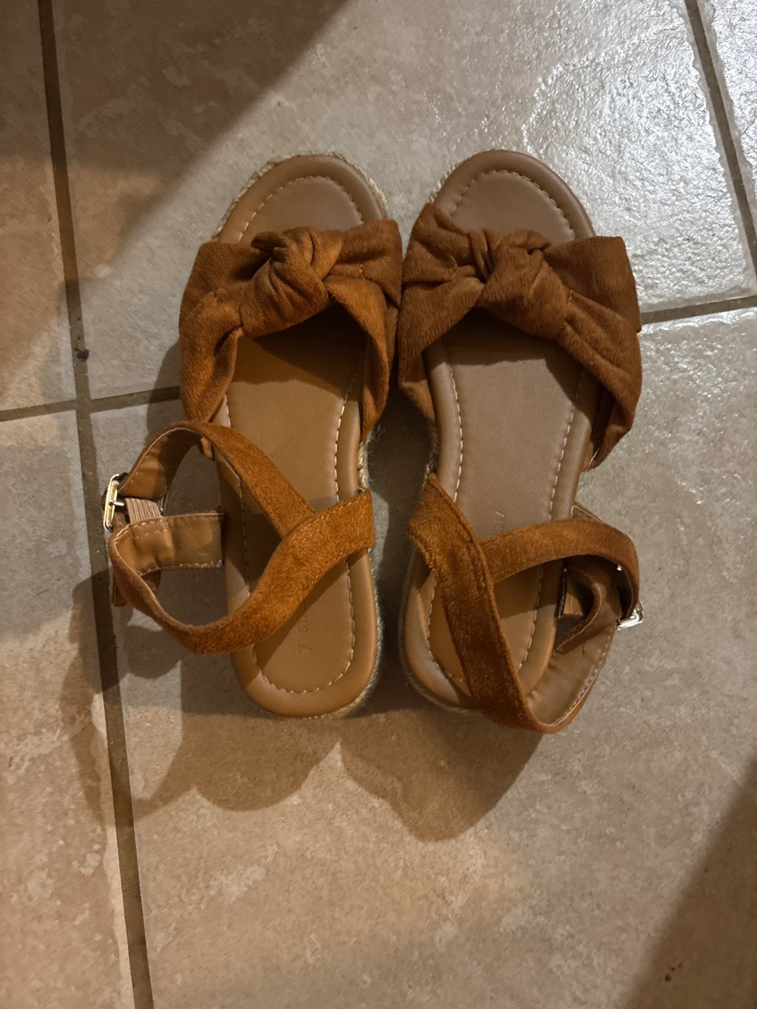 10Cute brown sandals in a size 7! They have a knot design on the top and a buckle closure. Perfect for summer!