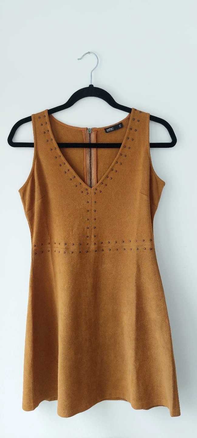 15Here's a cute brown sleeveless suede dress! It's a size small and features a V-neck with a zipper at the back. The dress has some nice detailing with small studs.