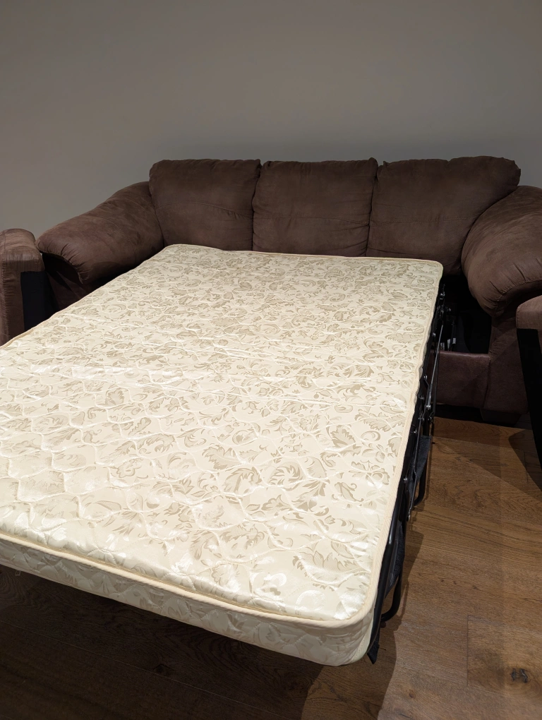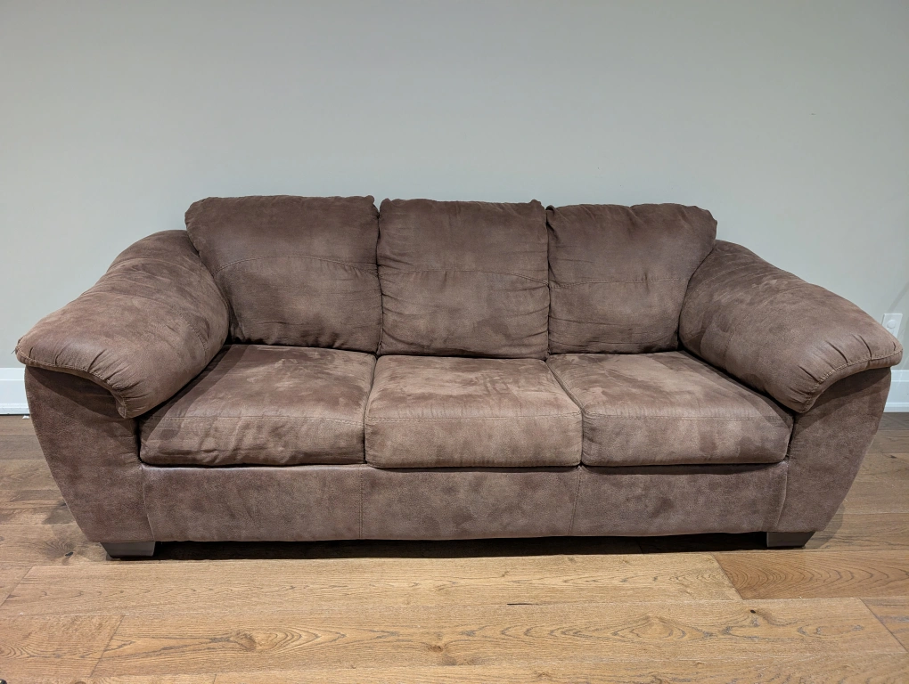 72Selling a sofa bed from Ashley Furniture in a coffee brown colour! This comfy sofa easily converts into a bed, perfect for guests or small spaces. The sofa is in great condition. Soft faux suede material I have videos of how to open and close the sofa upon request
