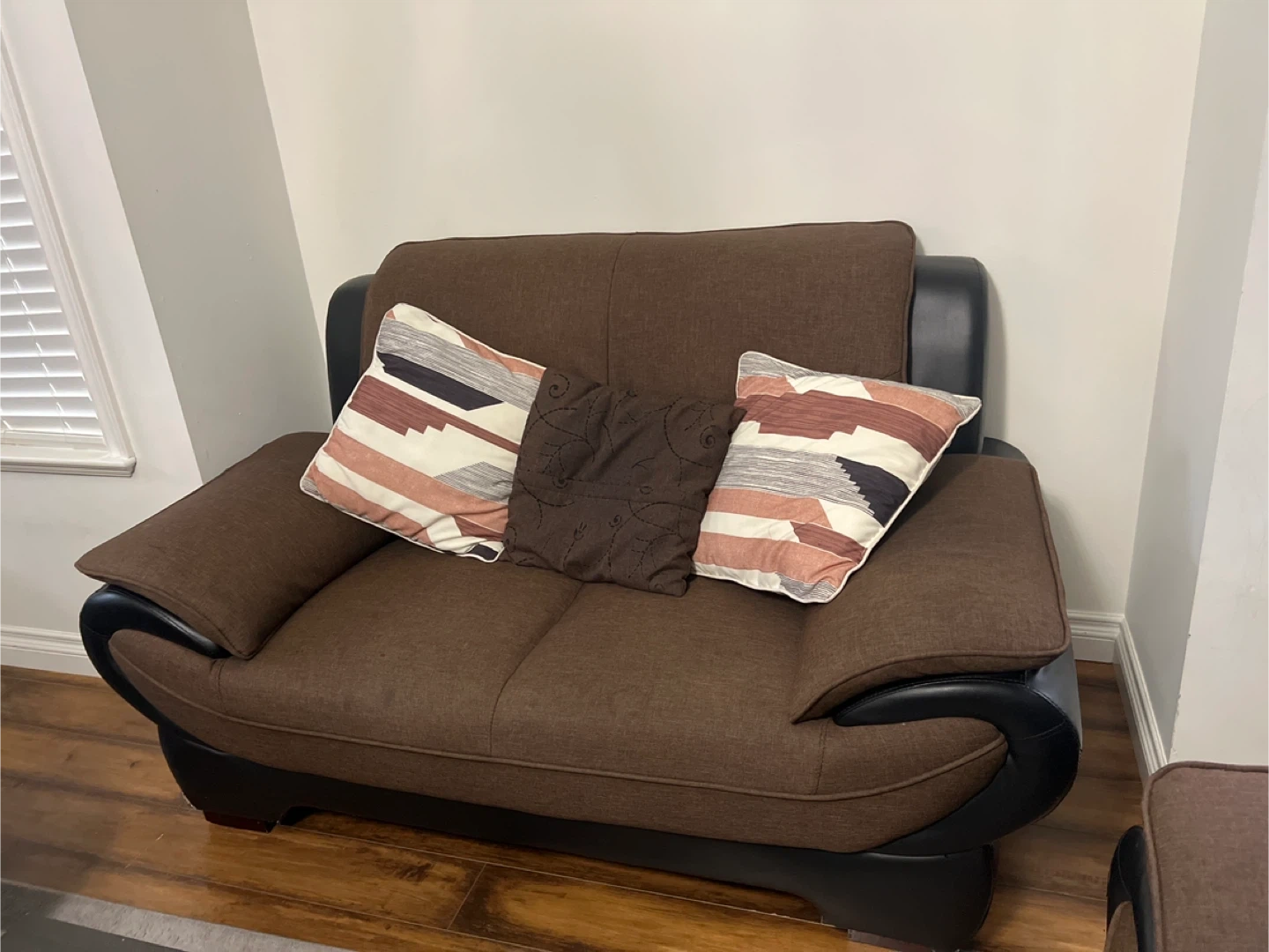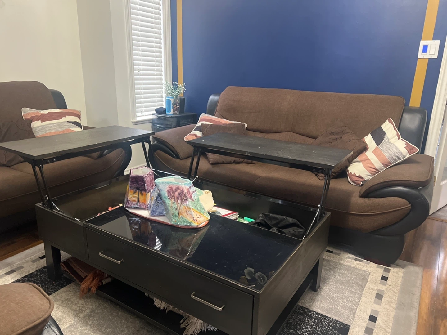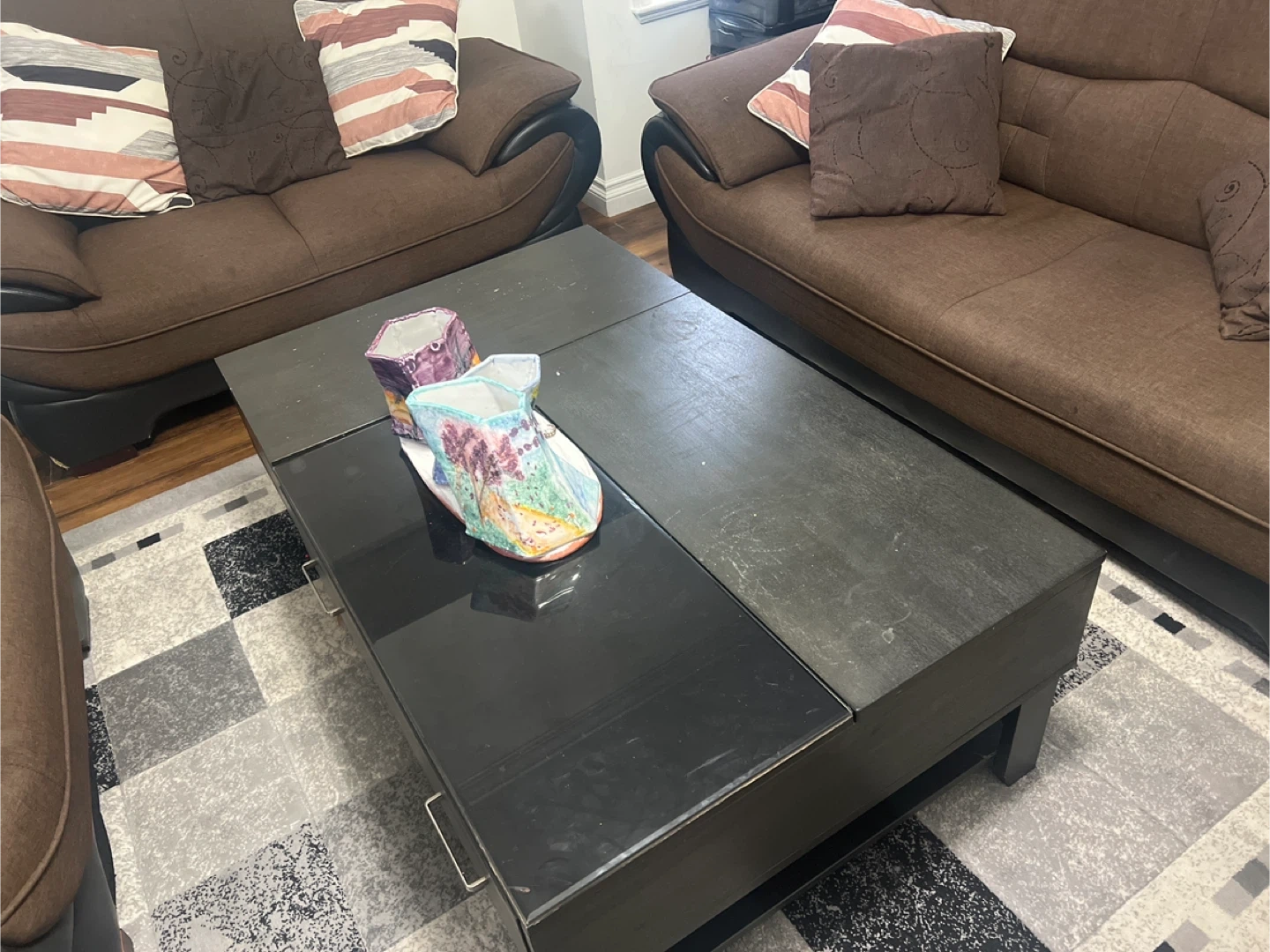 60Selling a comfy brown sofa set that includes a lift-top coffee table! Perfect for adding a touch of warmth to your living room. The sofas have a unique design with black accents, and the coffee table's lift-top feature adds extra convenience.