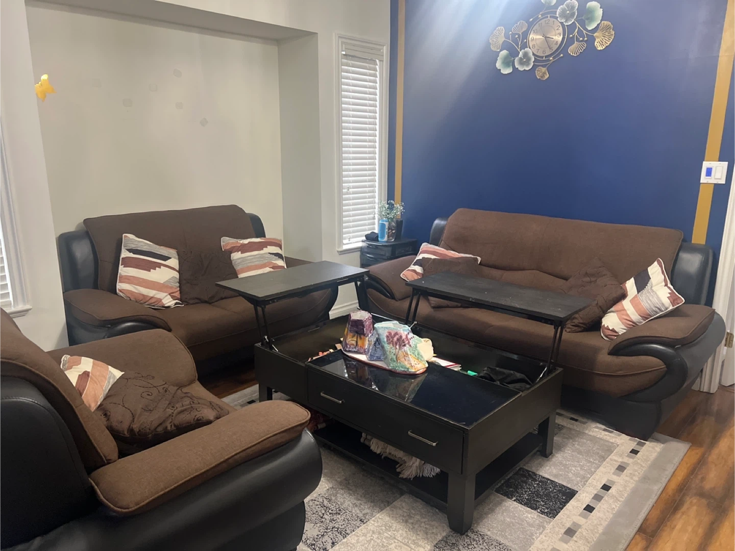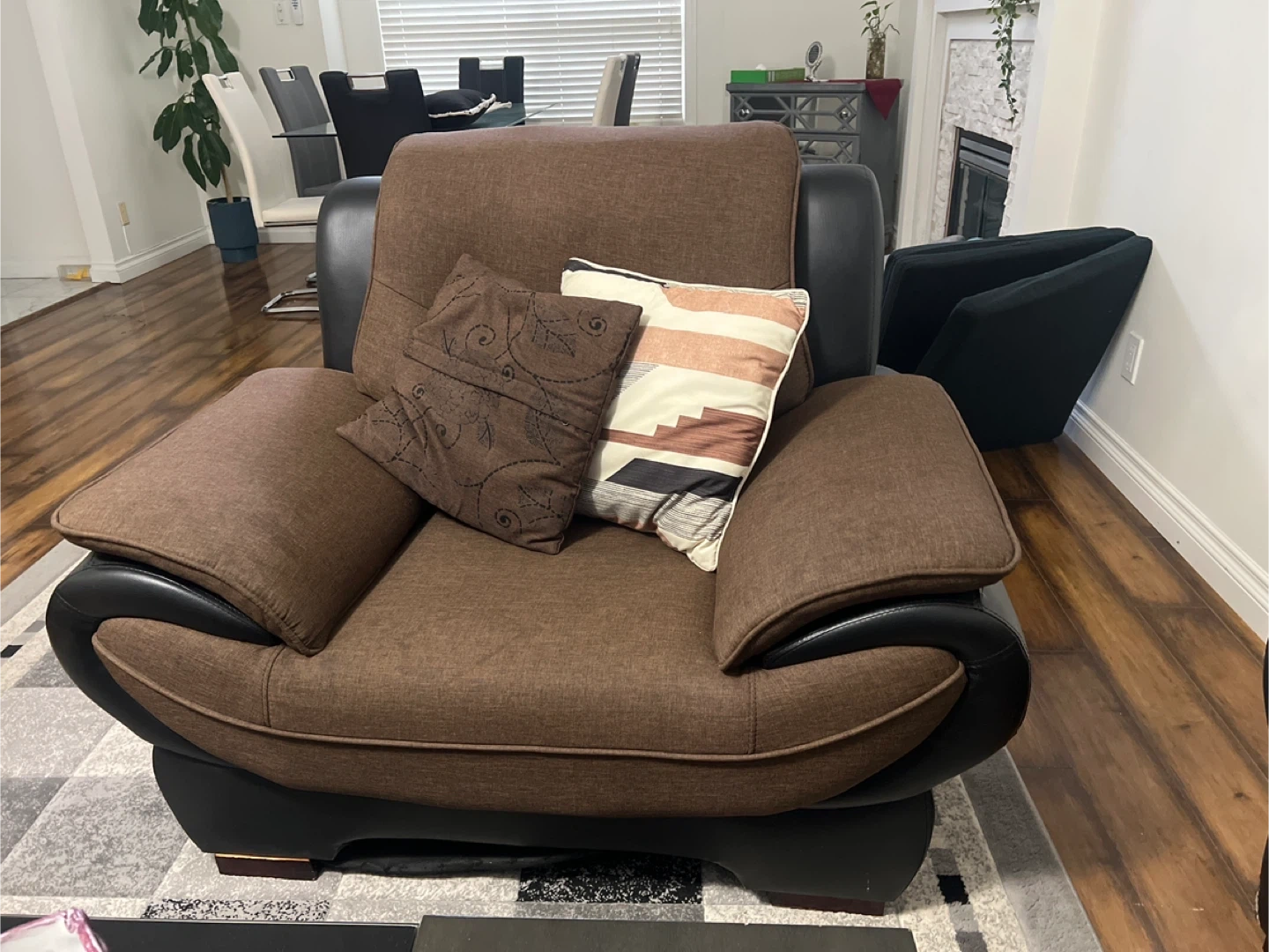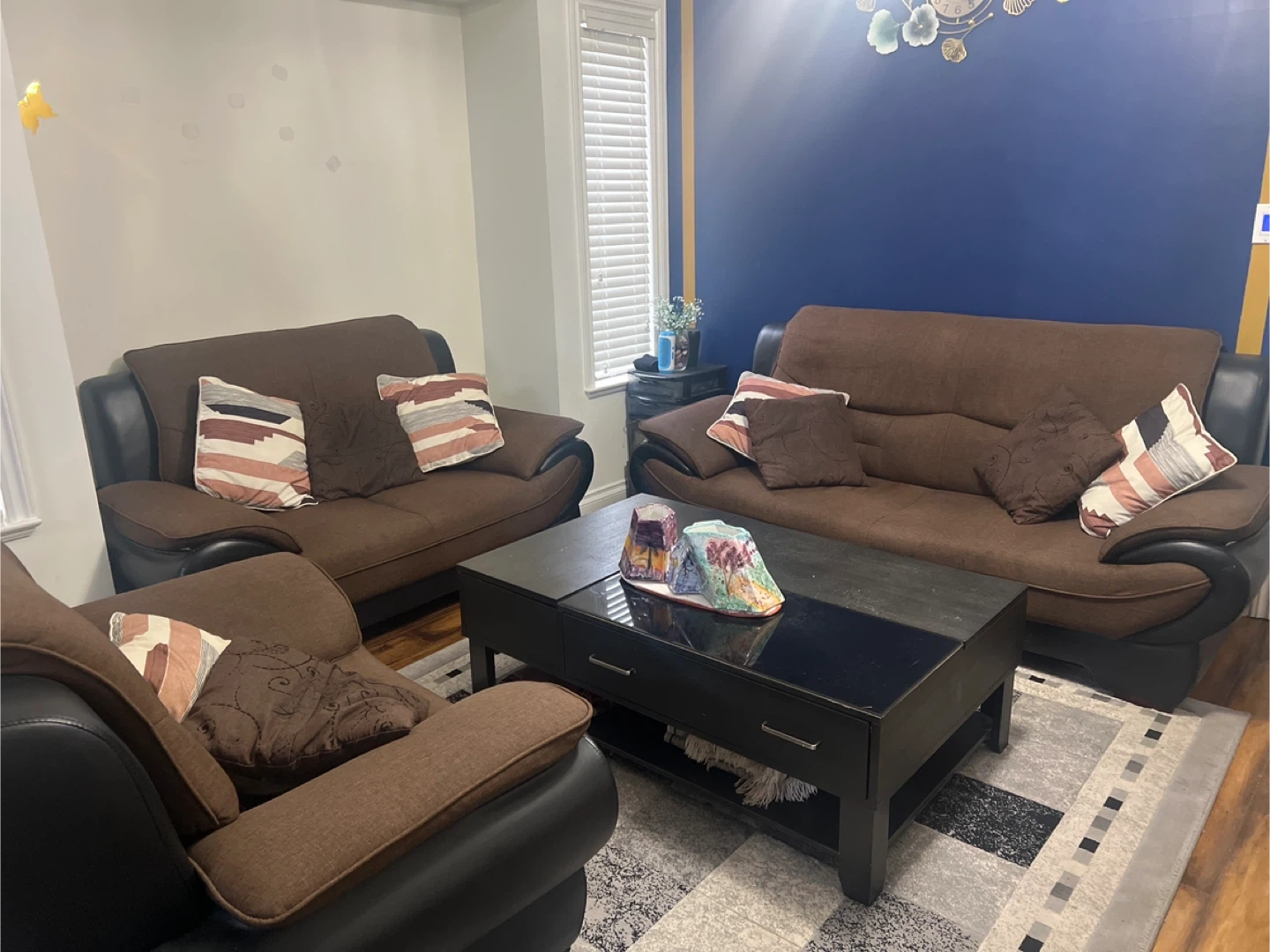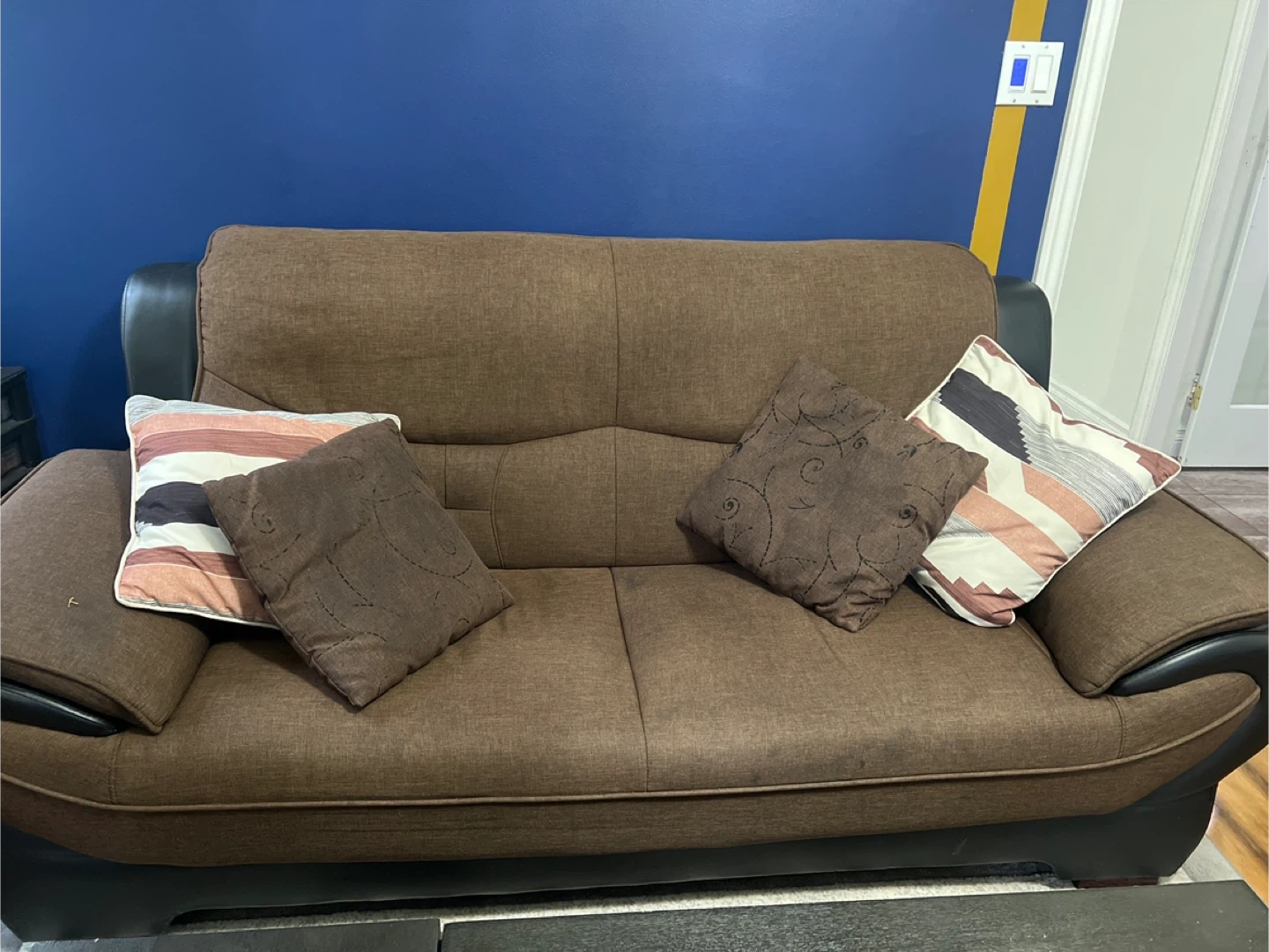 60Selling a comfy brown sofa set that includes a lift-top coffee table! Perfect for adding a touch of warmth to your living room. The sofas have a unique design with black accents, and the coffee table's lift-top feature adds extra convenience.