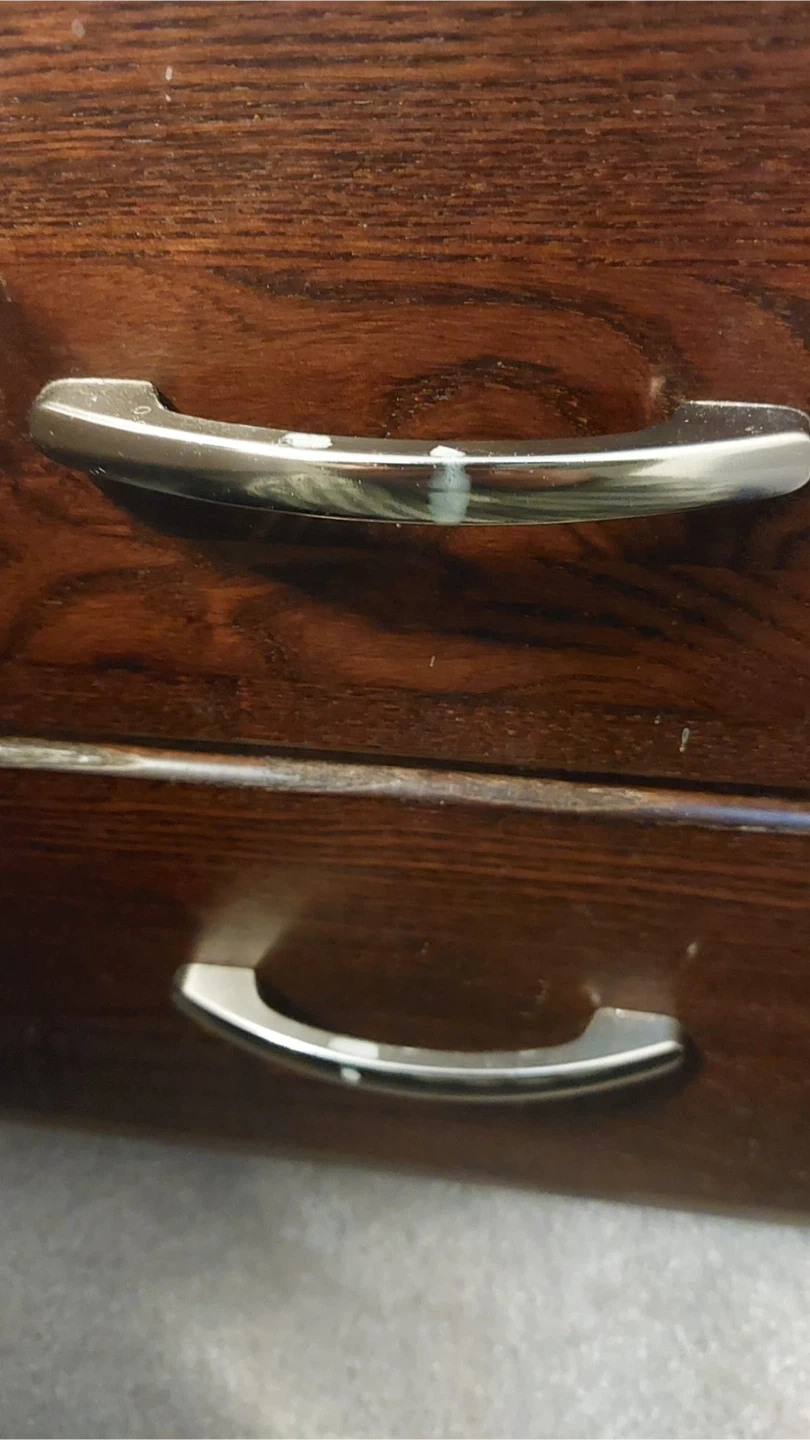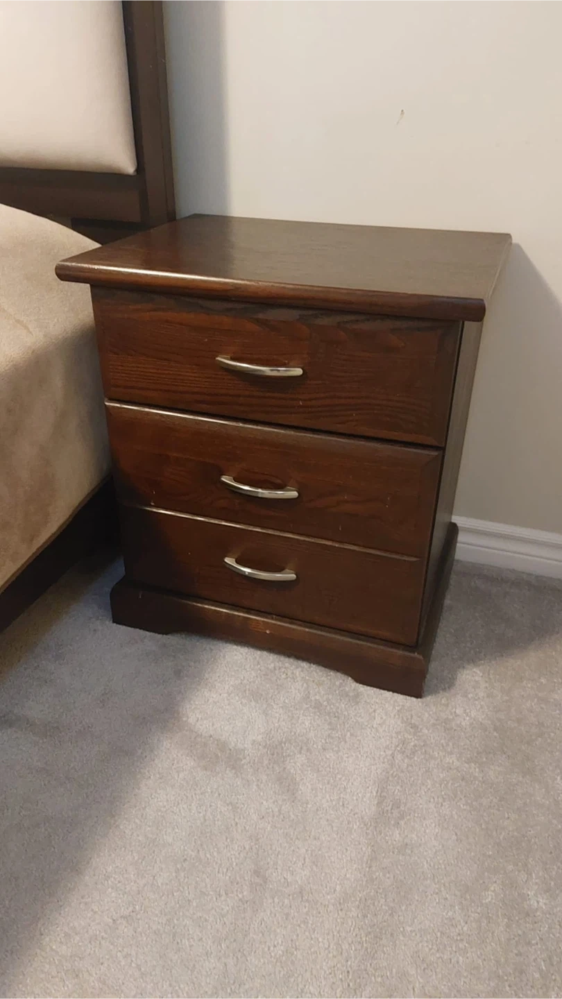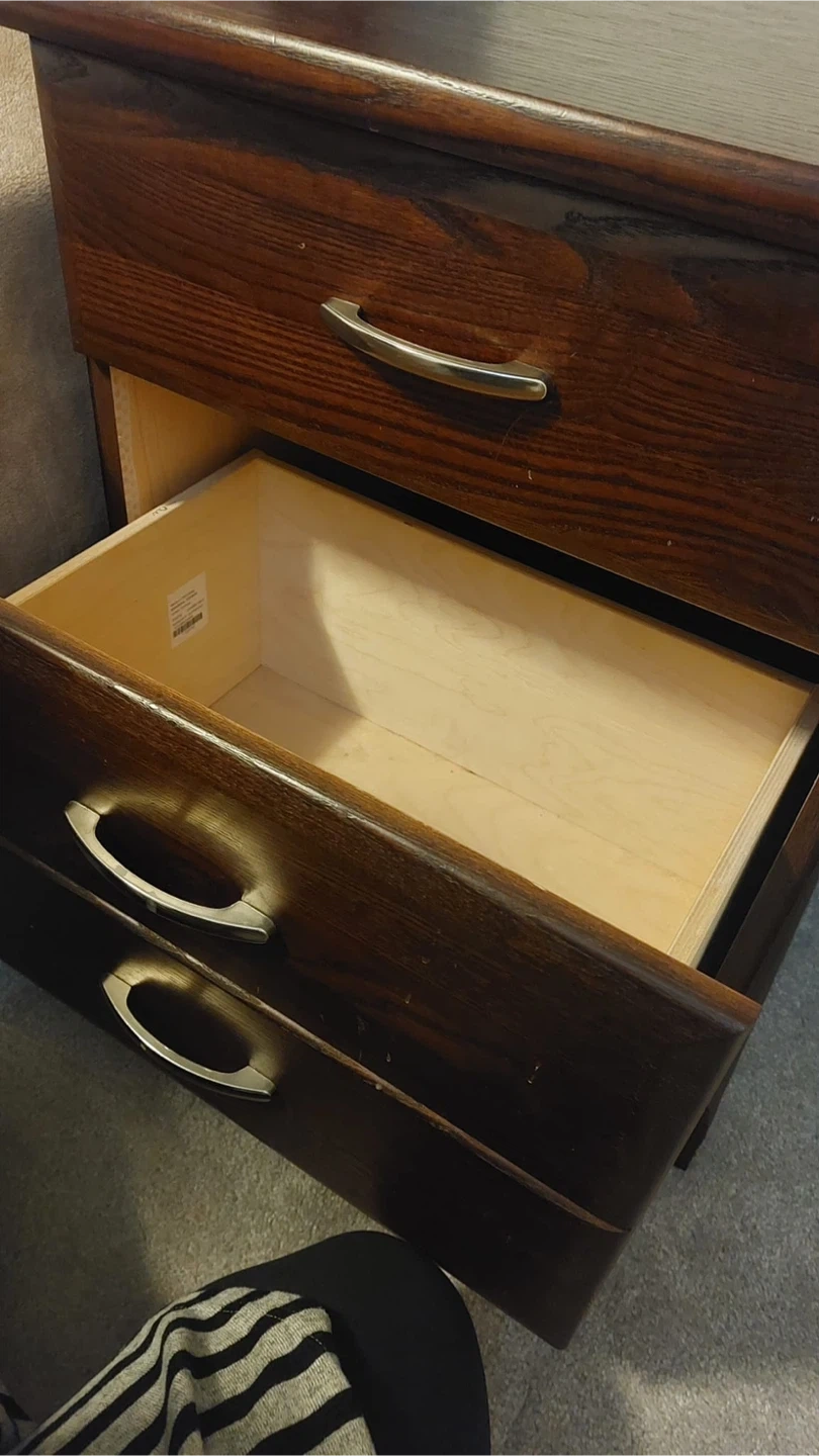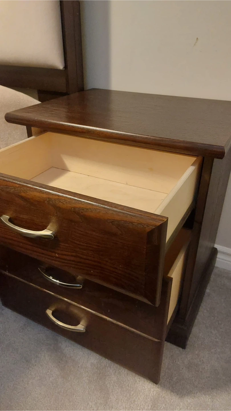 10Here's a nice brown wood nightstand with two drawers! It's perfect for keeping your bedside essentials organized and within easy reach. The drawers slide smoothly, and the overall condition is great. Add a touch of classic style to your bedroom with this lovely piece of furniture