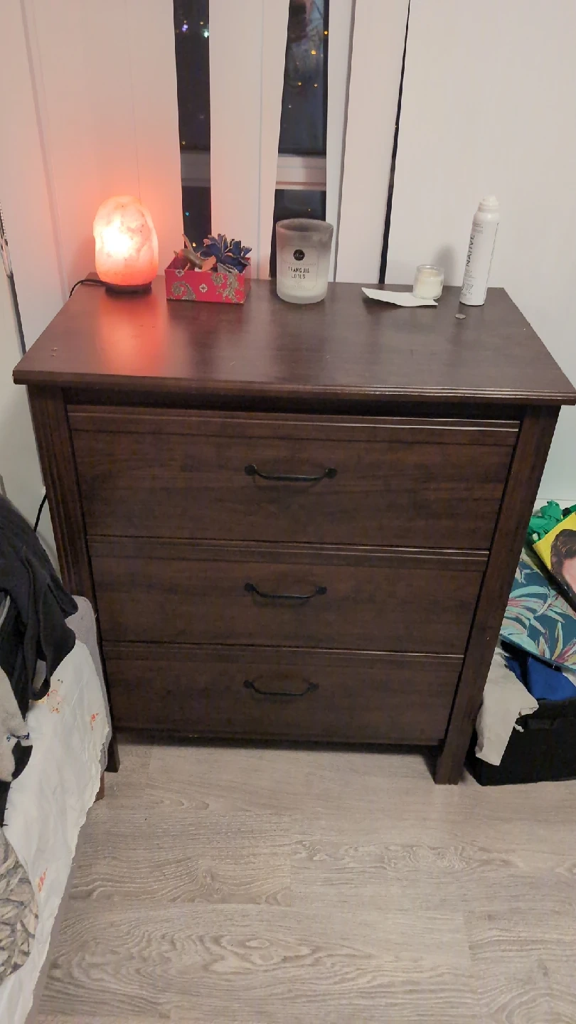 35Here's a sturdy brown wood dresser with three drawers! It's perfect for adding some extra storage to your bedroom or any other space in your home. It's in great shape and ready to go to a new home. pick up asap. moving sale