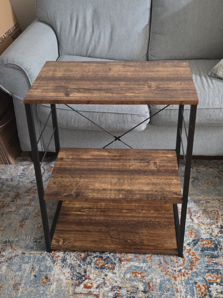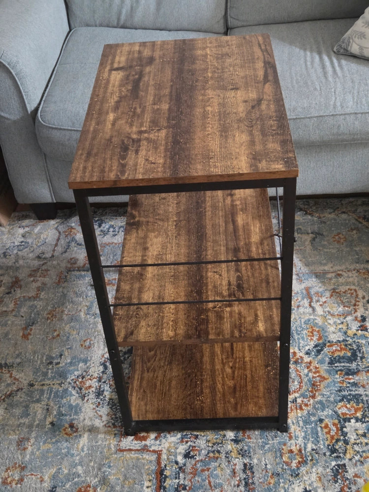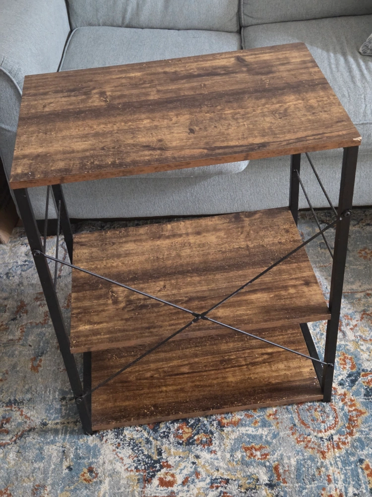 Selling a brown wood grain side table with black metal frame. It has three shelves, so it's great for storage or display. Perfect for a living room, bedroom, or entryway!