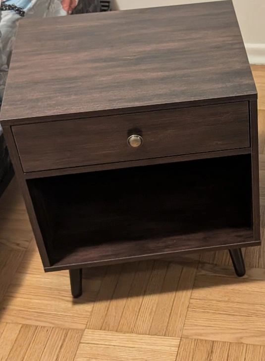 127Selling a cute little brown nightstand! It has a drawer and an open shelf for extra storage. Great for small spaces or as a bedside table. Pick-up only
