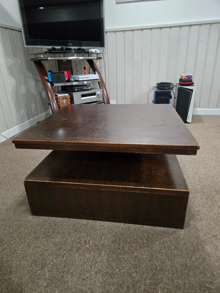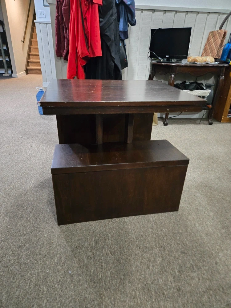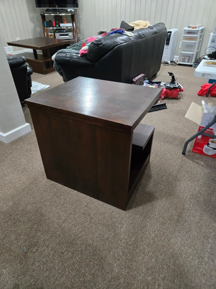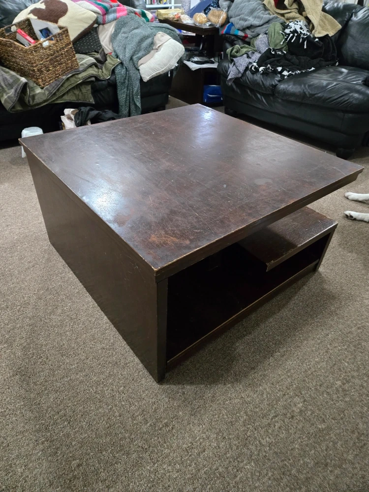 18Sturdy brown wooden coffee and side table with built-in shelves. Perfect for adding a touch of rustic charm to your living room and keeping your magazines or remotes neatly stored underneath. Unique looking. Sold together Pick/up in St.Vital