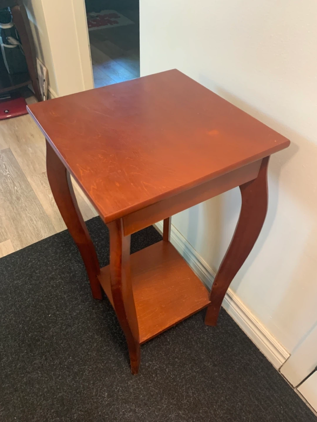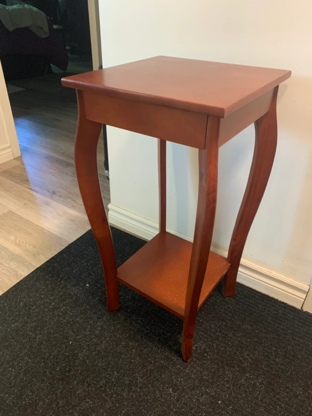 A lovely brown wooden side table, perfect for any room. It features a classic design with curved legs and a lower shelf for extra storage or display. It's sturdy and in great condition, ready to add a touch of elegance to your home