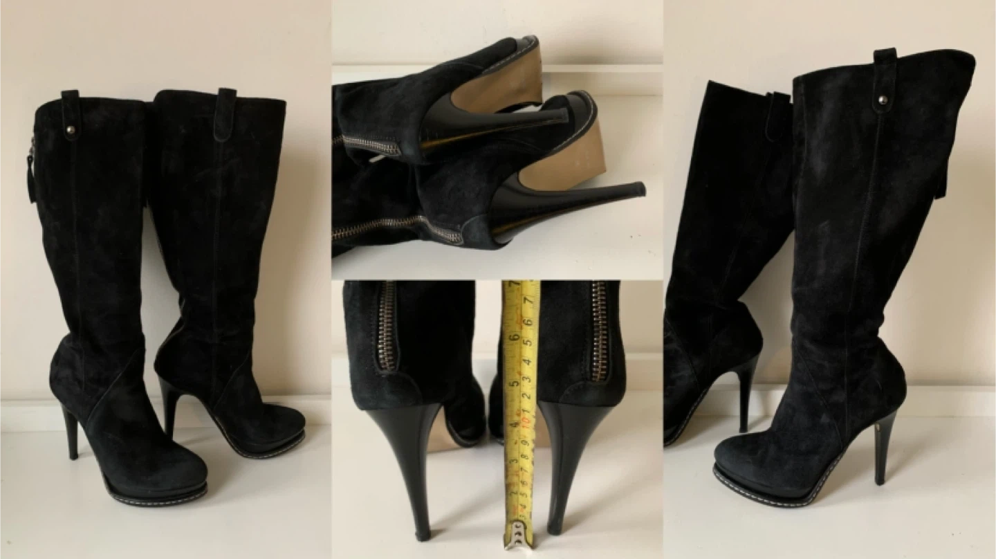 These stylish black suede platform heel boots are in great condition! They feature a side zipper and a sleek design. The heel height is approximately 4.5 inches. Perfect for adding a touch of elegance to any outfit! Made in Italy. From smoke and pet free home. Cash only. Serious inquiries only. Check out my other listings. There may be something else you're also interested.