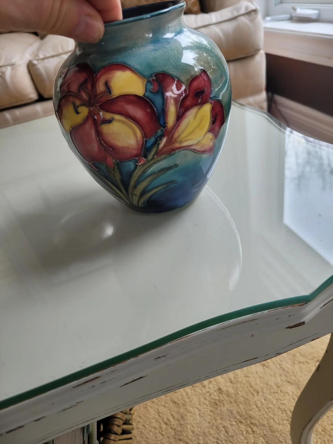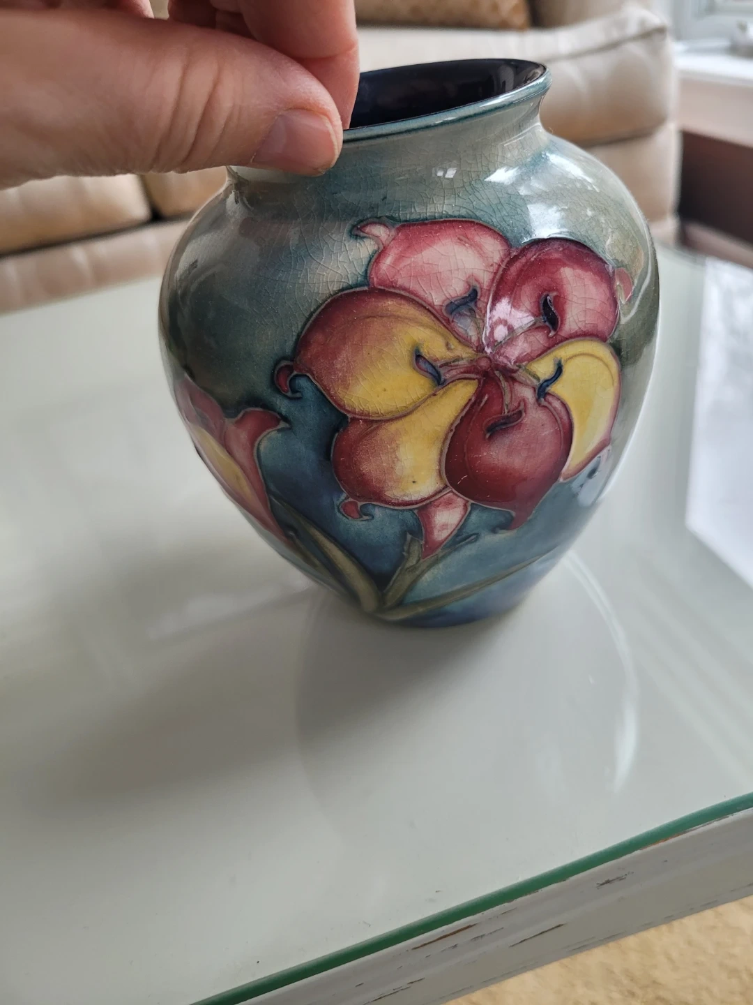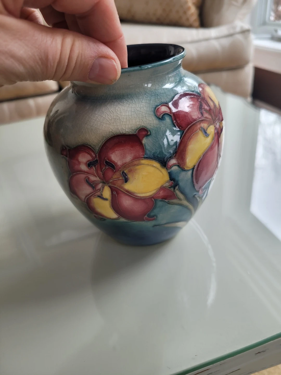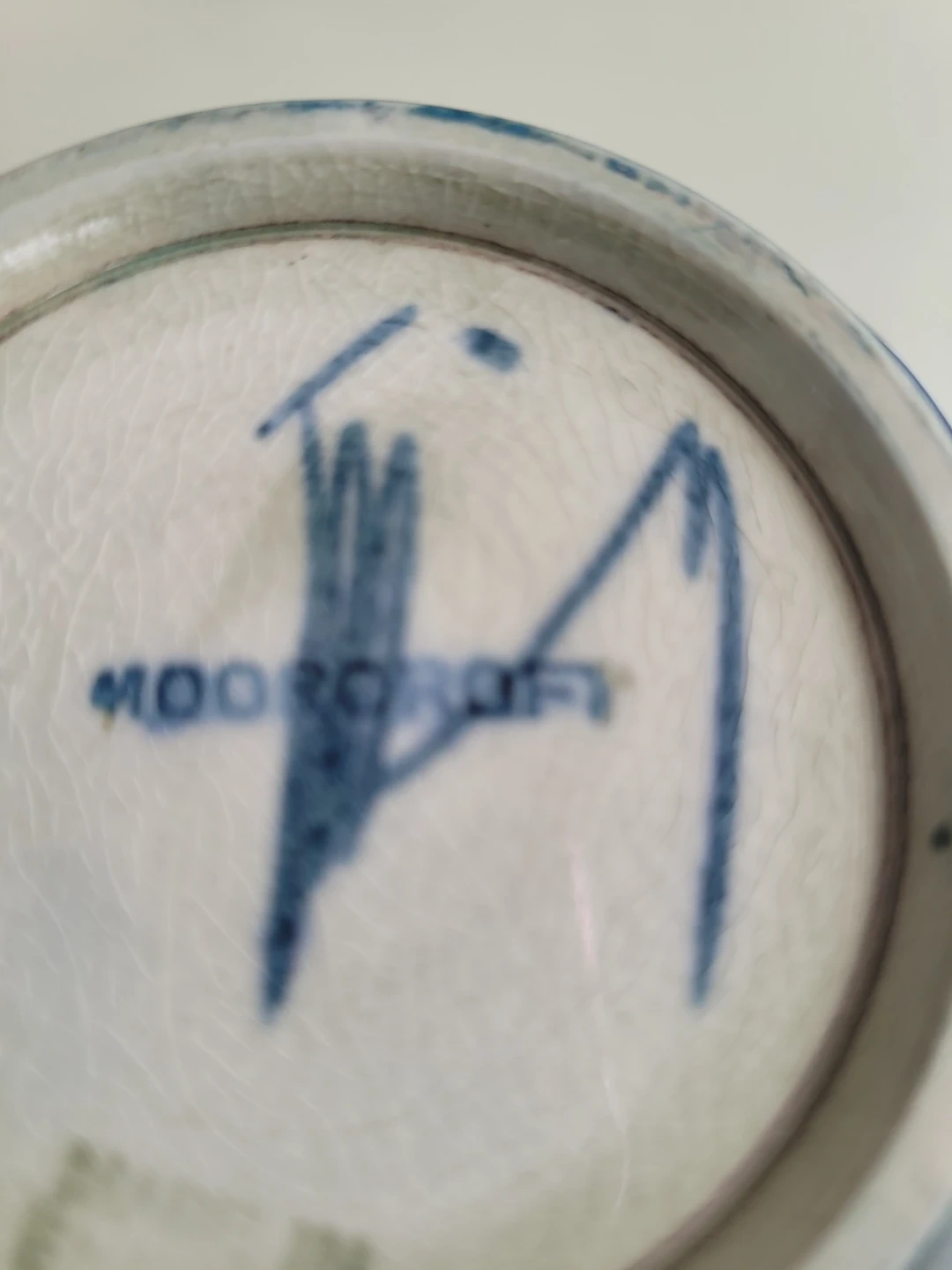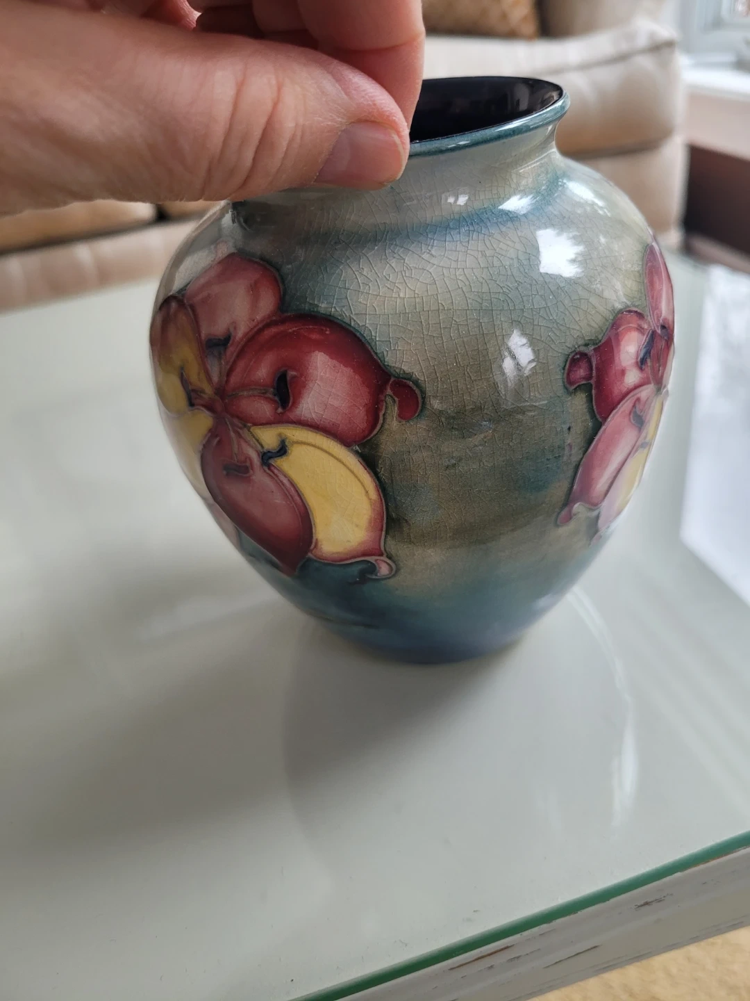Vintage MOORECROFT Pottery Vase is approx 5" high. Signed on base, I think this is the son Walter? Made in England