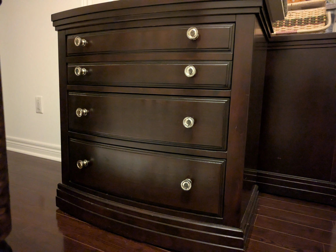 Here's a pair of lovely Broyhill 3-drawer chest, perfect for adding some storage and style to your bedroom or living space! It features a rich, dark brown finish and classic design. The chests are in good condition. Solid wood with polished nickel hardware. sold as a pair or separate.