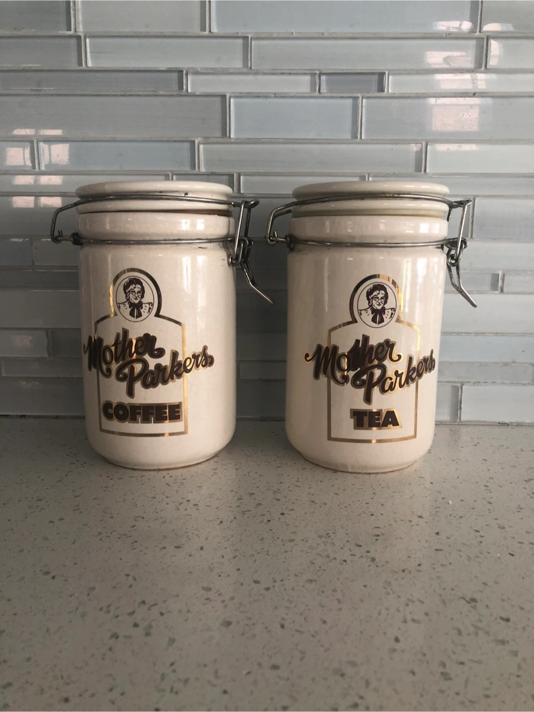 Set of two vintage ceramic canisters from Mother Parker's. One is labelled 'Coffee' and the other 'Tea'. They have a swing-top lid with a rubber seal for freshness. Perfect for keeping your kitchen counters tidy!