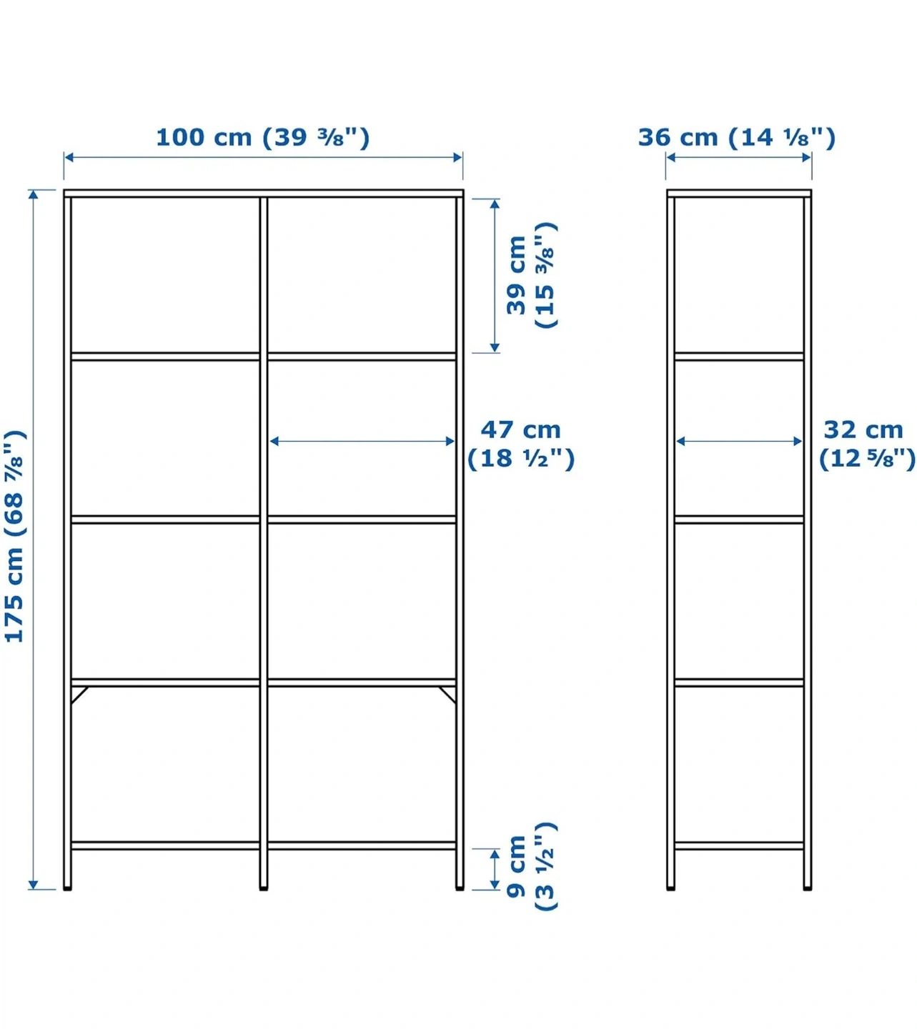 This is the IKEA KALLAX shelf unit. It's black and measures 100 cm wide and 175 cm tall. The shelf depth is 39 cm.