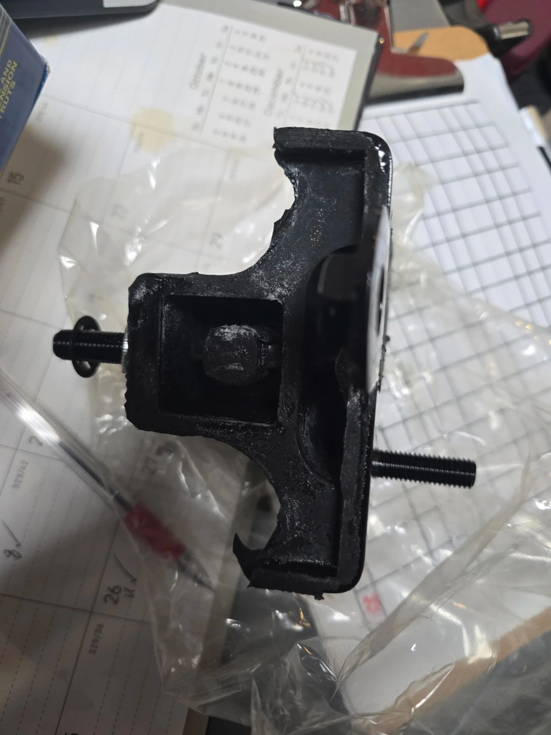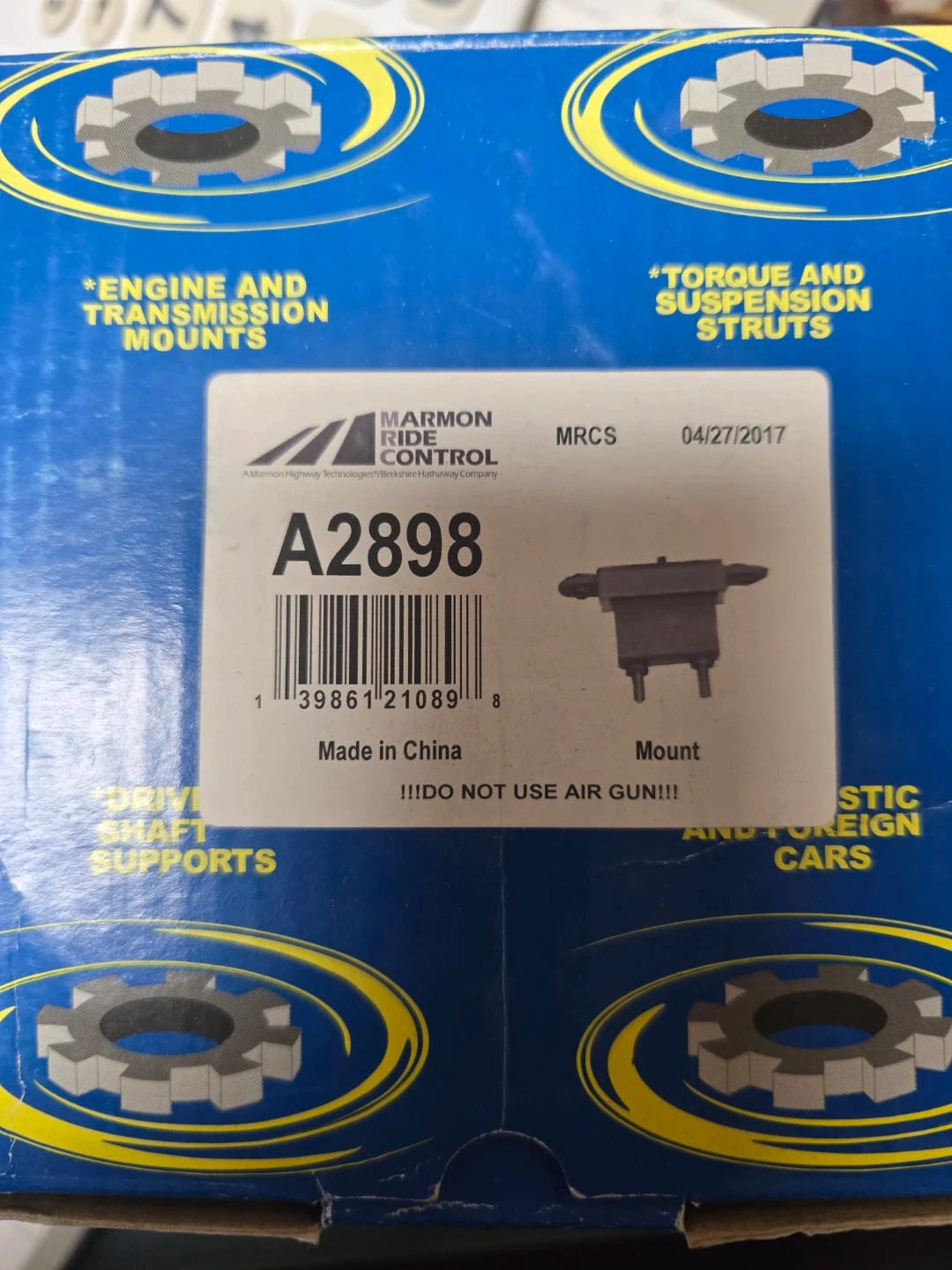 This is a Marmon Ride Control A2898 engine mount. It's made of rubber and metal construction. This part is for engine and transmission mounts.