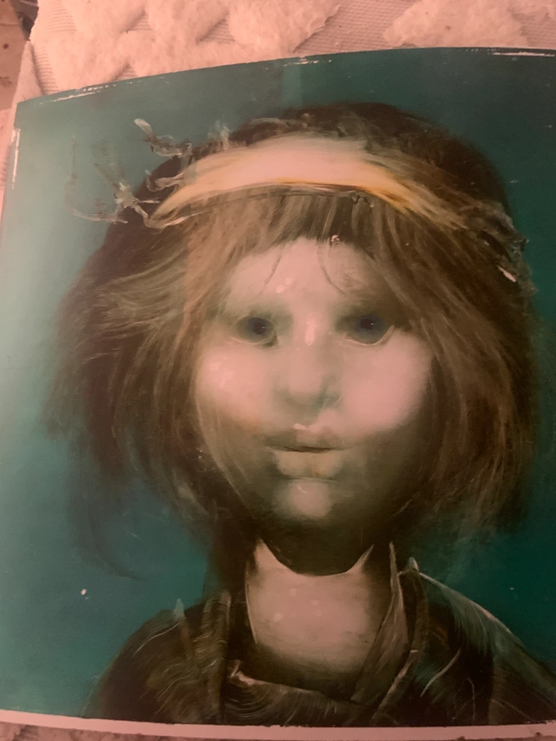 This is an art piece with a signature that appears to read Hungarian Name'. The artwork depicts a stylized portrait of a person with distinctive blue eyes and dishevelled hair. The background is a dark teal colour. The piece is on a wooden backing.