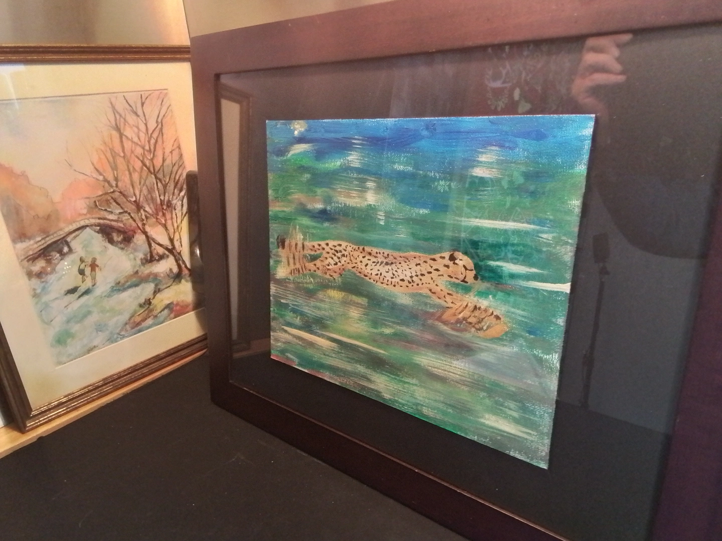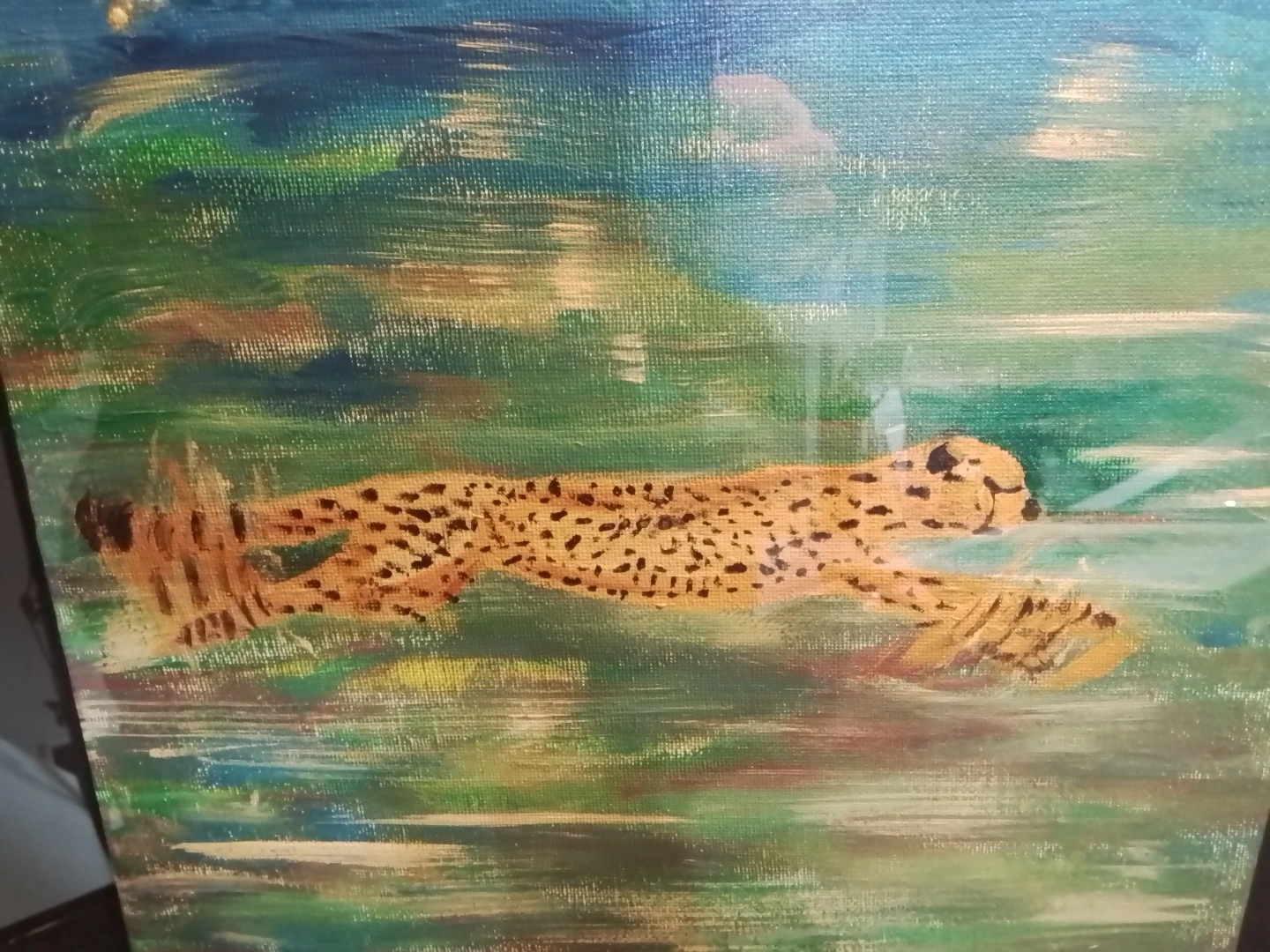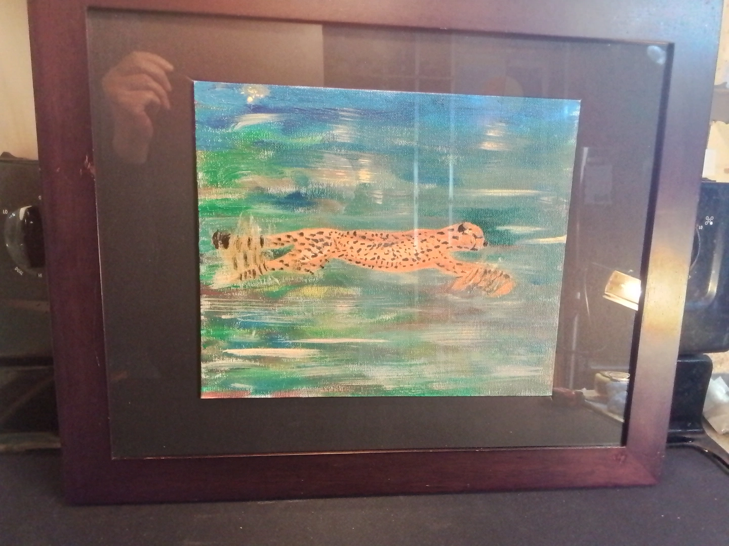 Bruckner Cheetah Abstract Painting This is a unique, framed original painting of a cheetah in water, signed by the artist Bruckner. The painting captures a dynamic scene with vibrant colors and expressive brushstrokes. It's a standout piece that would add a touch of wildlife charm to any room. Abstract Oil Painting On Canvas Running Cheetah Period Framed 21", No issues Measurements: 21" x 17 * Artist: Bruckner * Subject: Cheetah in Water * Framed: Yes * Original: Yes Looking to add a touch of the wild to your space? This painting is calling your name! Don't miss the chance to own a Bruckner original. P.S. If you see this ad, it's still available! Original framed painting. Depicts a cheetah running through water. Features vibrant colours and unique style. Signed by the artist. Pickup at Young Street and Steels Ave