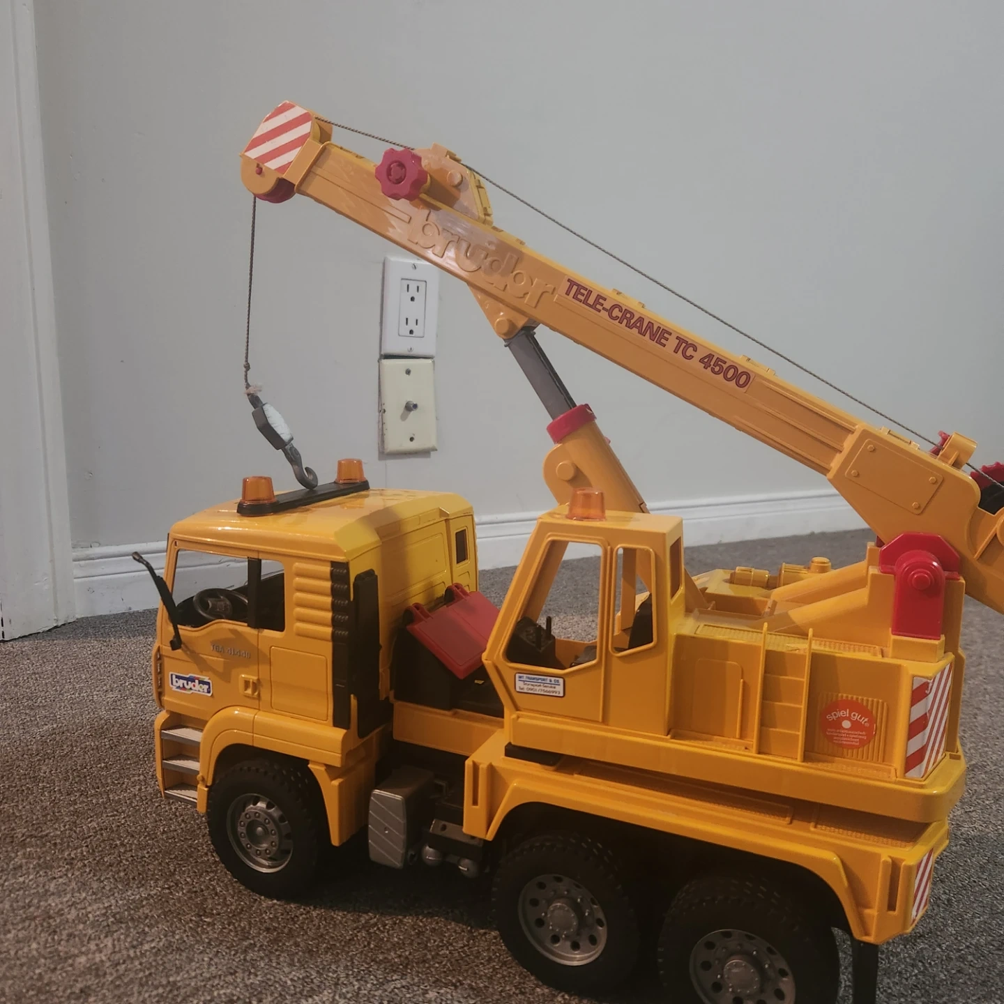 10Perfect christmas gift, in compared to new n overpriced toys, it's a great option. Excellent quality. Check my other ads. Each toy cost varried from 10 to 20. Trucks n crane are 20$ each. The car track with 2 cars are 15$ The Seesaw is 15$. Selling a Bruder Tele-Crane TC 4500 toy truck and other toys.. It's in great shape and ready for a new home. Perfect for kids who love construction vehicles!