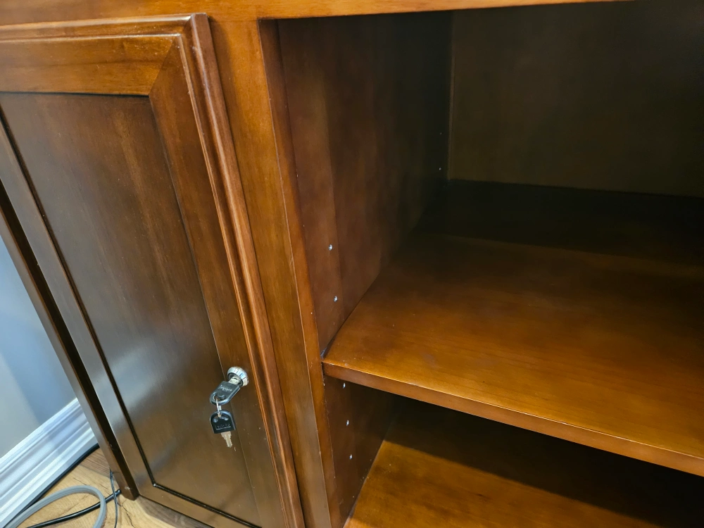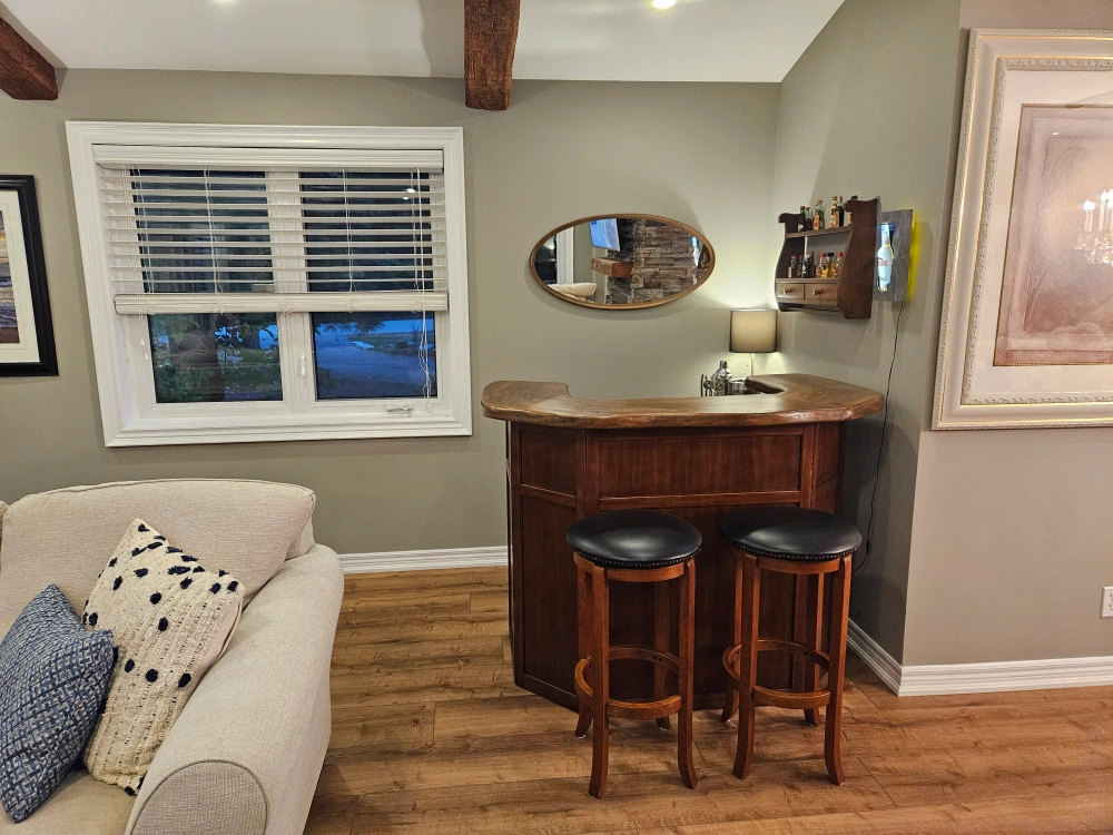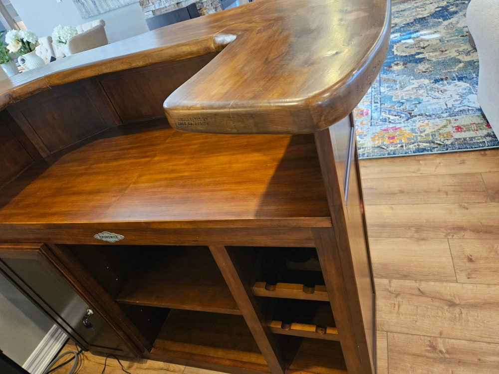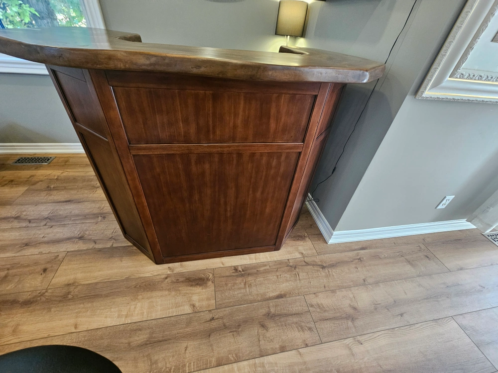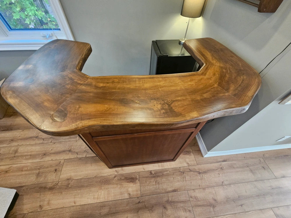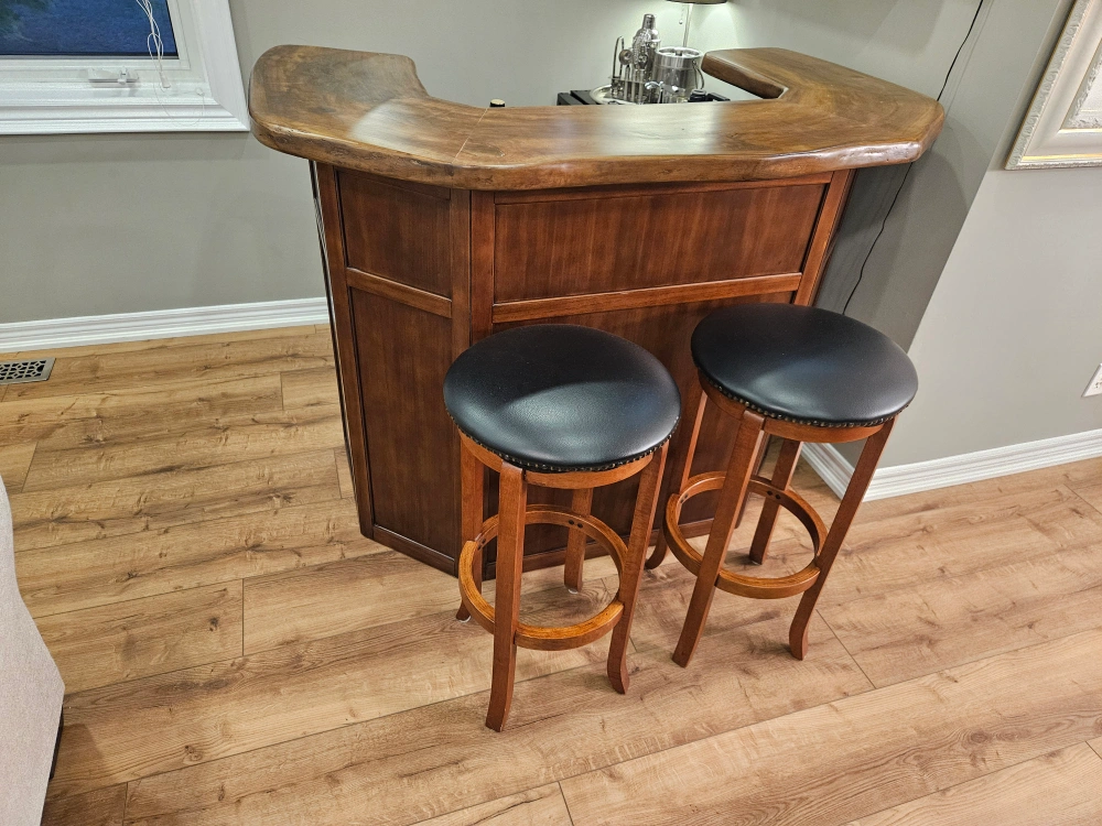 Add a touch of elegance to your home with this bar featuring a custom live edge cherry wood top. The bar constructed by the Brunswick company (known to also build pool tables). Perfect for entertaining, cozy drinks, or a stylish kitchen, living room or rec room accent. Comes with 2 matching bar chairs for a complete setup. Plenty of storage space for glasses, bottles, includes a lockable door with keys. -Unique, one-of-a-kind design -Sturdy, high-quality construction -Excellent condition – well cared for