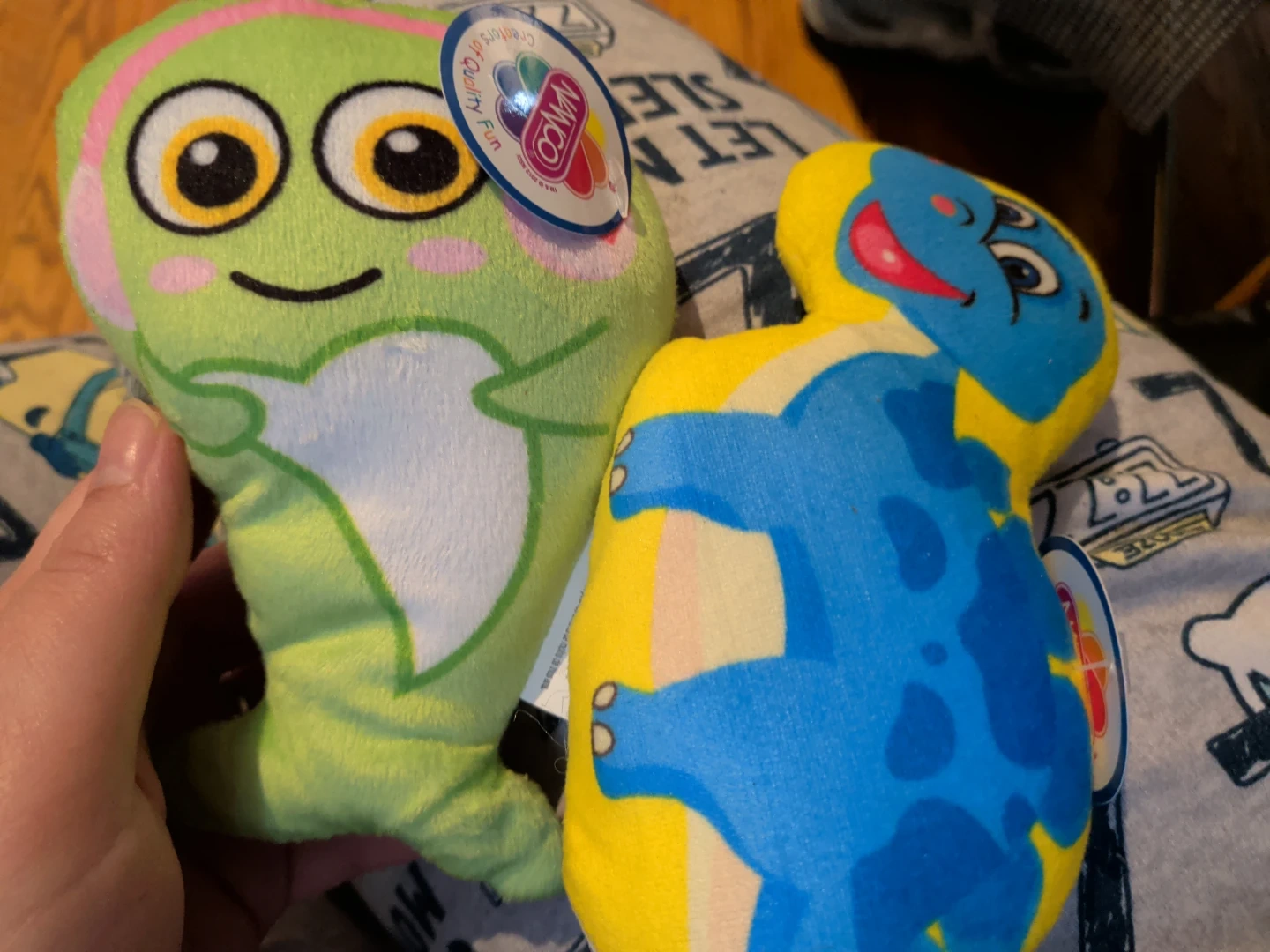 Set of two adorable plush toys. Features a friendly green alien with pink accents and a cute blue and yellow dinosaur. Soft and cuddly, they're great for little ones!