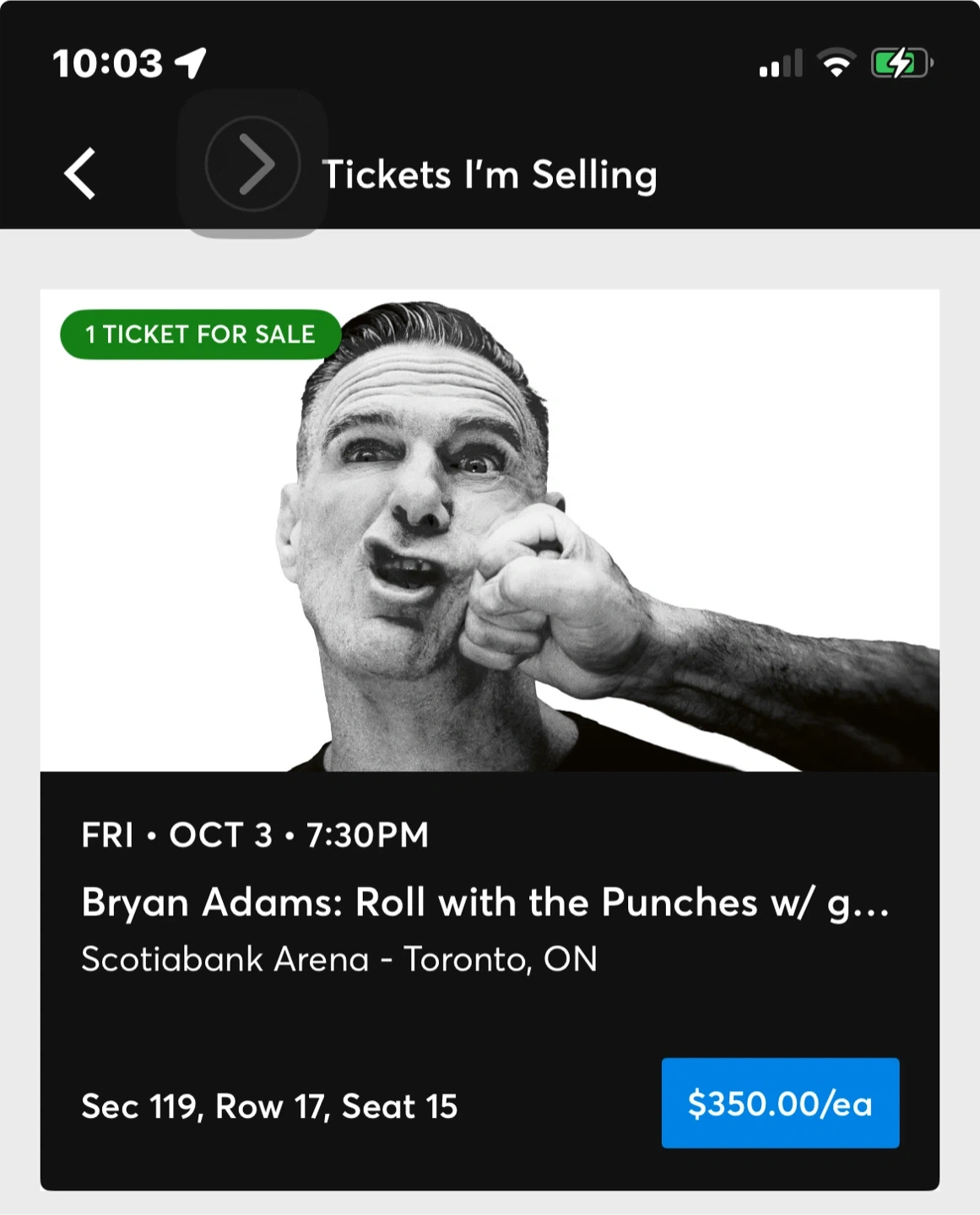 Selling one ticket to see Bryan Adams at Scotiabank Arena in Toronto on October 3rd at 7:30 PM! The seat is in Section 119, Row 17, Seat 15.