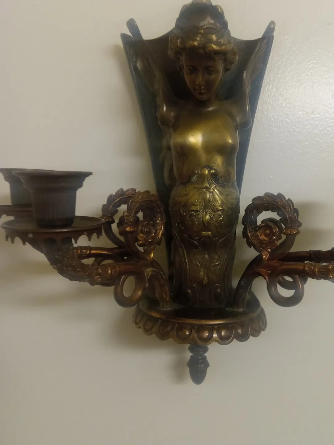Ornate wall sconce with a vintage style female figure. This piece appears to be made of metal with a brass-like finish. It's designed to hold candles. Adds a decorative touch to any room!