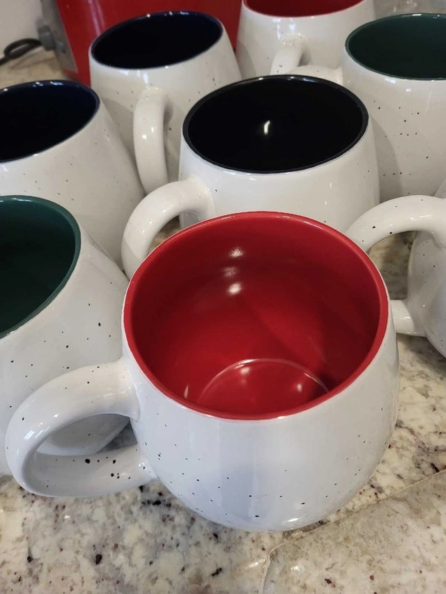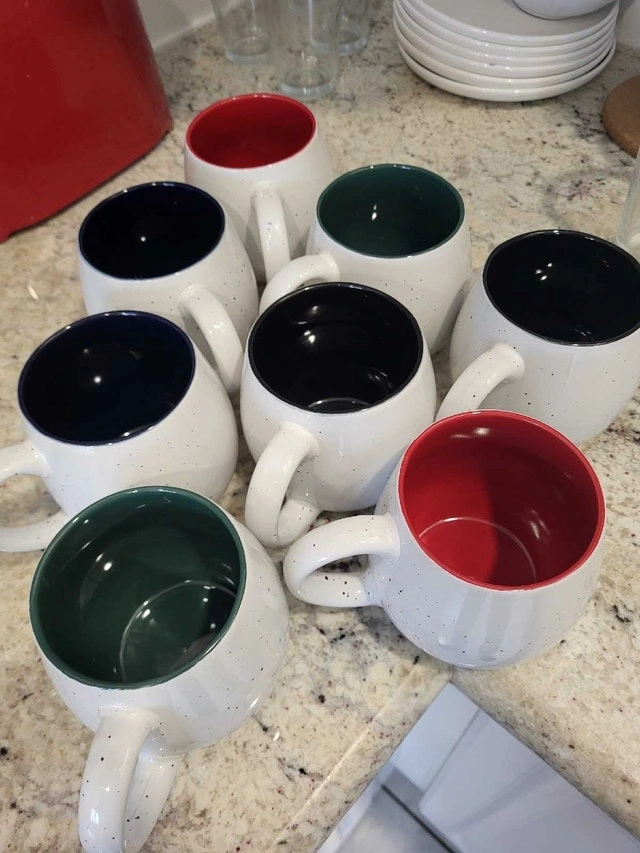 Giving away a beautiful set of 8 LIFVER coffee mugs, perfect for adding a pop of colour to your morning routine! These mugs have barely been used and are in like-new condition. They feature a speckled exterior with a different colour on the inside of each mug. These 16oz mugs are great for coffee, tea, or any beverage you fancy. They also make great soup bowls and can hold a hot drink for longer than other mugs due to their thick walls and narrower top.