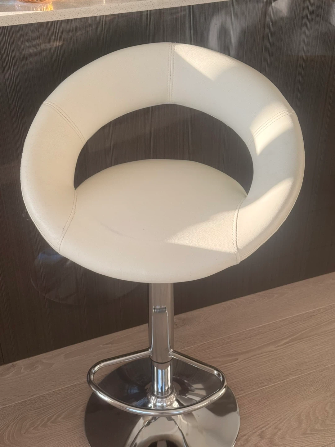 This set of white adjustable bar stools features a comfortable, padded seat and backrest. It has a chrome base and a built-in footrest for added convenience. The height is adjustable, making it suitable for most kitchen islands or bars. Small amount of discoloration seen seat of one barstool, shown in 2nd picture.
