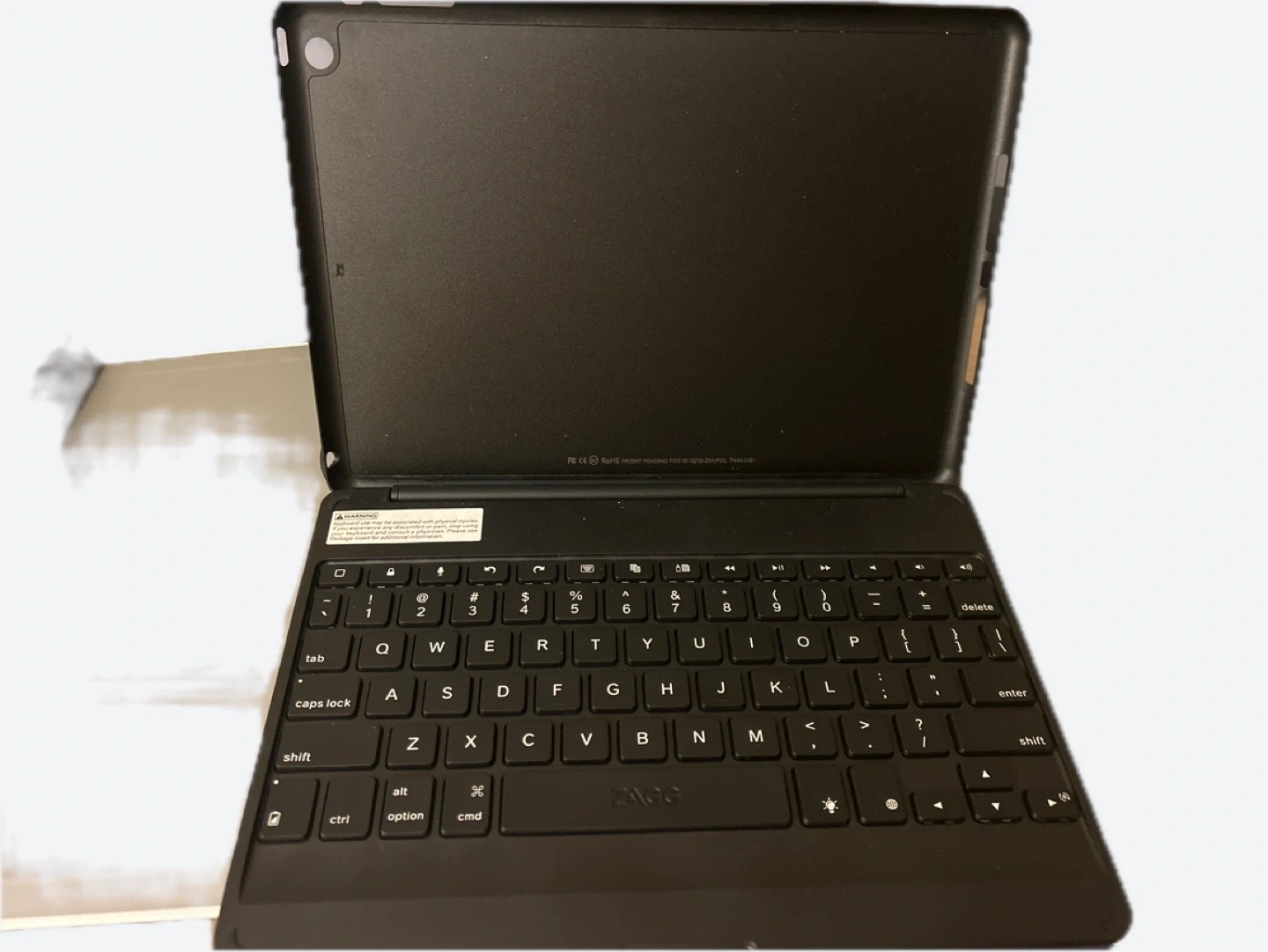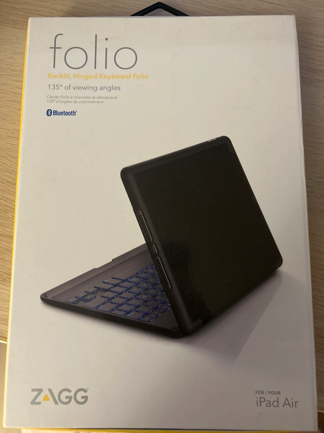 Selling a ZAGG Folio backlit, hinged keyboard folio for iPad Air. It features 135° of viewing angles and Bluetooth connectivity. Comes with the original box and cable inside. Only used once.