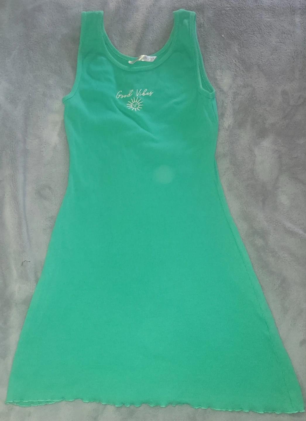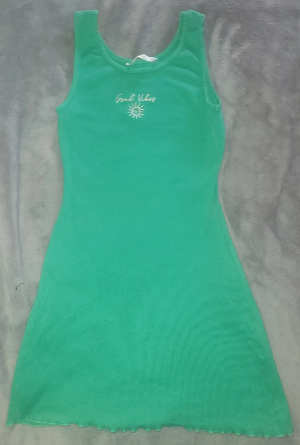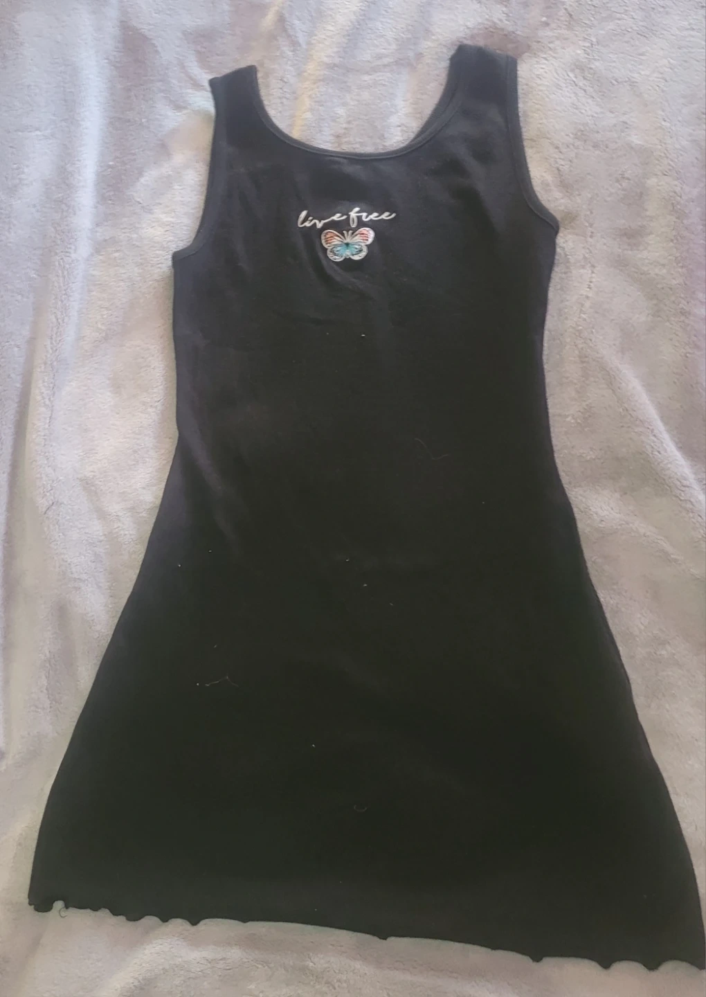 Two girls' sleeveless dresses, one black with 'live free' and butterfly graphic, and one green with 'Good Vibes' graphic. Both have lettuce hem detail. Cotton blend material.