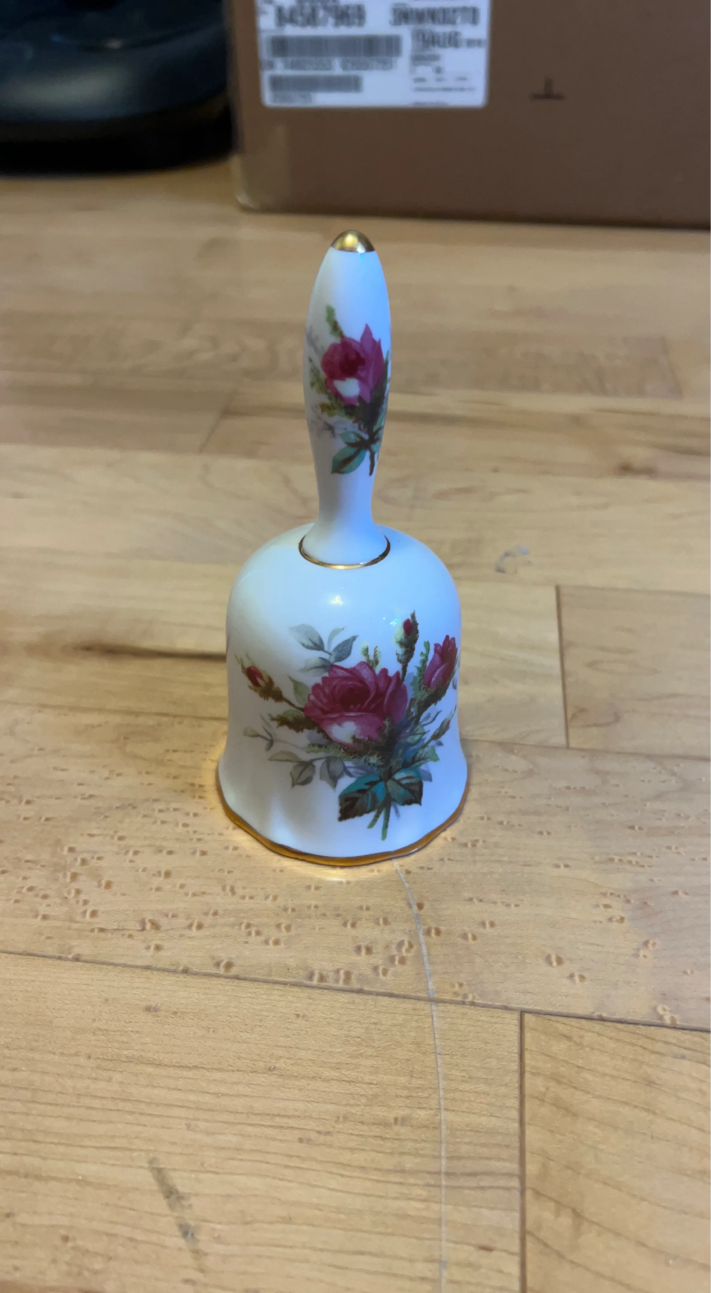 Pretty porcelain bell featuring a delicate rose design. Gold trim accents the base and handle. Great for decoration!
