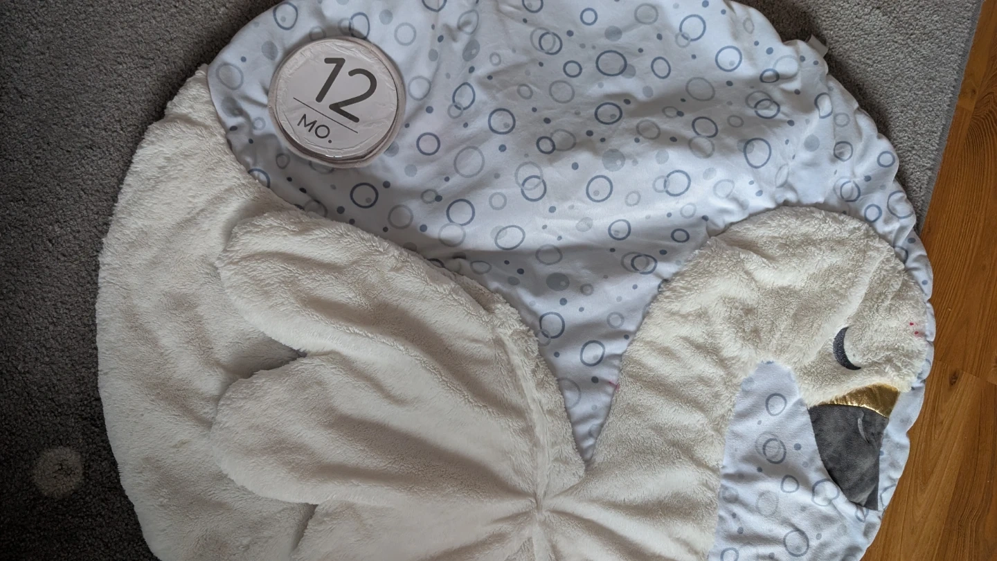 Soft, comfortable playmat for baby in a cute swan design. Includes milestone cards to capture picture-perfect memories. It's great for tummy time and play. Some of the cards have wear around the edges because they went through the washing machine by accident