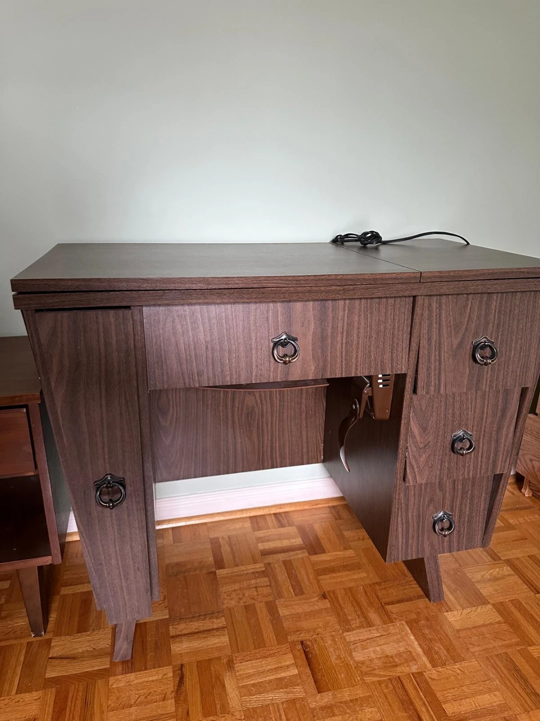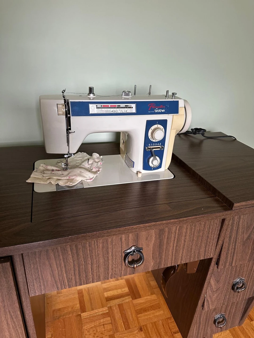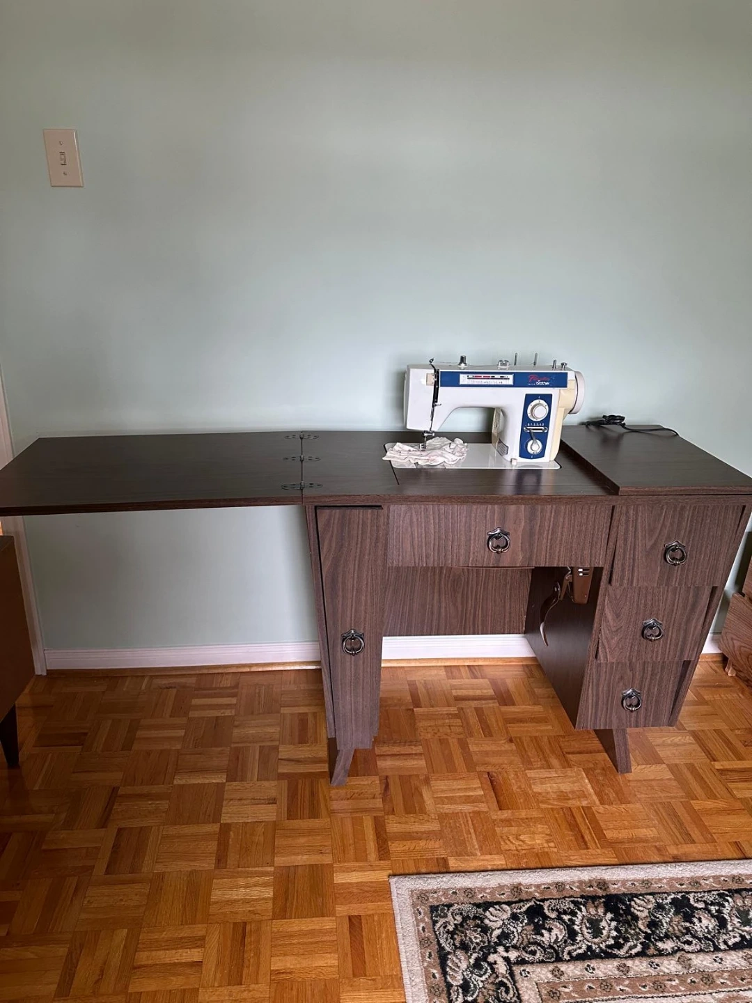 This is a Brother sewing machine that fits into a dark wood veneer desk. The desk has drawers on the right side and a fold-out extension on the left. It's a great setup for any sewing enthusiast!